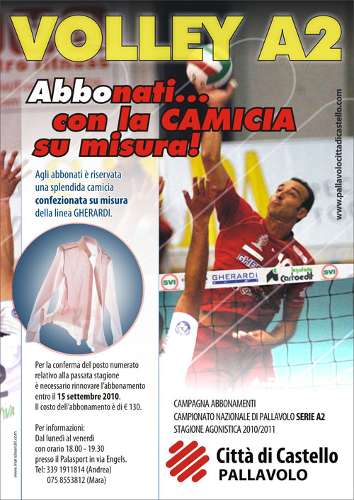 Partirà lunedì prossimo, 30 agosto, la campagna abbonamenti della Gherardi Cartoedit Svi Città di Castello. Tutta la città sarà tappezzati di manifesti con il logo con l’immagine in primo piano di capitan Rosalba nell’esecuzione di una schiacciata. Lo slogan di quest’anno è “ABBONATI…CON LA CAMICIA SU MISURA” perché uno degli sponsors della società tifernate, Alessandro Gherardi, ha avuto la splendida idea di premiare tutti i tifosi che sottoscriveranno l’abbonamento alle 15 partite interne della squadra di Radici al prezzo di 130 euro con una camicia, confezionata su misura, della linea Gherardi. Ovviamente la prelazione sarà riservata ai vecchi abbonati che potranno confermare, entro il 15 settembre, il loro posto numerato per seguire i propri beniamini poi la vendita degli abbonamenti sarà aperta a tutti. Considerato anche che, quest’anno, tutti i posti del Palaengels saranno numerati, acquistare l’abbonamento prima dell’inizio del campionato garantirà il posto per vedere tutte le partite interne del Città di Castello Pallavolo.