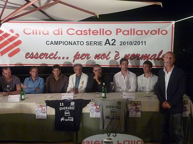 Esserci… per noi è normale. Recitava questa frase lo striscione che campeggiava dietro il tavolo dove sedevano i cinque nuovi acquisti della Gherardi Cartoedit Svi Città di Castello presentati ieri sera a stampa ed autorità, assieme ai due giovani del vivaio che faranno parte del roster della squadra di Andrea Radici. Il presidente Arveno Joan ha ringraziato tutti per la presenza, evidenziando che: “Molti giocatori, durante il mercato, si erano offerti per venire a Città di Castello, segno di grande fiducia nei confronti della società tifernate. Gustinelli, Alcherigi e Radici hanno lavorato benissimo in estate per allestire una squadra competitiva, non ci limiteremo ad affrontare un’annata come quella dell’anno scorso, nella quale, comunque, abbiamo ottenuti importanti risultati. Dobbiamo ringraziare tutti i giocatori, anche quelli che hanno cambiato maglia”. Anche il prosindaco di Città di Castello, Luciano Bacchetta, ha portato il saluto, particolarmente gradito perché ha dichiarato: “La pallavolo di A2, oggi, è la prima realtà sportiva di Città di Castello che è una città fantastica alla quale non manca nulla per essere prima anche nello sport; l’intera città segue con passione questa realtà sportiva e tutti i tifernati credono in questa squadra: cercheremo di starle a fianco nella sua attività per tutta la stagione”. Mauro Alcherigi, il direttore sportivo della Gherardi Cartoedit Svi, ha posto l’accento sulla bravura di una società che ogni anno ha migliorato il proprio roster e ha portato in città atleti di grosso calibro. Ovviamente il piatto forte della serata era la presentazione dei nuovi giocatori che vestiranno la maglia biancorossa: prima i due babies del settore giovanile, Benedetti e Del Castello, poi Di Benedetto, Vedovotto (Una grande promessa della pallavolo italiana, così lo ha definito il presidente Joan), il libero Rossini e poi Manuele Ravellino e Martin Nemec. Ma, come ha poi sottolineato Valdemaro Gustinelli, è anche in corso un’altra importantissima fase della stagione, quella della campagna abbonamenti ‘Abbo… nati con la camicia su misura’ che ha già visto tanti tifosi sottoscrivere la propria tessere valida per tutta la stagione. Infine, il coach Andrea Radici: “Ci sono tante aspettative e tanta voglia di fare bene, in bocca al lupo a tutti”.