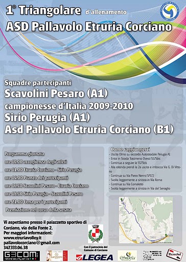 Sabato 9 ottobre l’associazione sportiva Pallavolo Etruria Corciano organizza presso il palazzetto dello sport del Comune di Corciano l’omonimo torneo. Un’occasione unica per assistere alla sfida tra le campionesse italiane della Scavolini Pesaro e la Despar Perugia, militanti nel campionato di A1 femminile, assieme alla locale squadra della Gecom Security Corciano di serie B1. Un evento unico per promuovere le attività pallavolistiche nel territorio. Partecipano dunque le ultime due squadre che sono state in grado di conquistare lo scudetto del massimo campionato italiano. Il programma della giornata prevede alle ore 10 l’accoglienza delle atlete. Il fischio d’inizio della prima gara sarà alle ore 11 e vedrà opporsi Corciano – Perugia; alle ore 14 prevista la pausa pranzo dei partecipanti; alle ore 16,30 in campo Pesaro – Corciano; mentre alle ore 18,30 si svolgerà il match Perugia – Pesaro. In chiusura di serata, alle ore 21 circa, cena per i partecipanti con la cerimonia di premiazione che si terrà nel corso della stessa. La formula del torneo è articolata in sfide da tre set a 25 punti obbligatori. Per ogni set vinto verrà assegnato un punto. Vincerà il torneo la squadra che acquisirà il punteggio più alto. In caso di ex aequo varranno gli scontri diretti.
