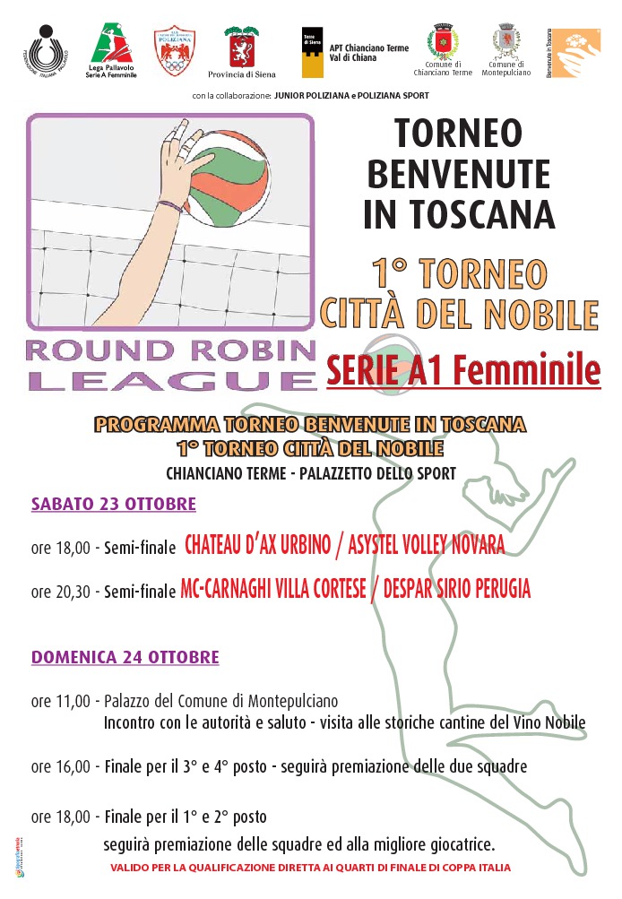 Grande sport in rosa al Palazzetto dello Sport di Chianciano Terme, che ospiterà, il 23 e il 24 ottobre 2010 un evento per la pallavolo femminile nazionale: il 1° Torneo di Volley femminile Città del Vino Nobile, ‘Benvenute in Toscana’. Mc-Carnaghi Villa Cortese, Chateau d’Ax Urbino, Despar Perugia e Asystel Novara sono tra le più forti squadre del campionato femminile di volley serie A1 e saranno proprio loro le quattro grandi protagoniste del torneo, che porteranno in campo la grande pallavolo firmata dalle donne. La Val di Chiana senese e, in particolare due dei suoi centri più importanti, Chianciano Terme e Montepulciano, ospiteranno, per la prima volta, varie fasi di un torneo così prestigioso, che si presenta con sicure garanzie di spettacolo, performance atletiche e standard tecnici eccezionali. Anche questo evento, come molti altri in preparazione, entra a far parte di un ampio ventaglio di offerta turistica rivolta specificamente alle donne, e per questo parte integrante del progetto regionale ‘Benvenute in Toscana’. Questo progetto nasce con una duplice valenza: quella di proporsi come vera e propria offerta turistica declinata al femminile, ma anche come valido e innovativo strumento di marketing per gli operatori più attenti ed evoluti. Non si tratta di un torneo qualunque, oltre ai grandi nomi del Volley femminile e alle squadre di indubbia fama, questo appuntamento sportivo si inserisce all’interno del circuito Round Robin League 2010/2011 che, al termine di una serie di confronti riservati alle società di serie A1, designerà le due squadre che accederanno direttamente ai quarti di finale della Coppa Italia 2010/2011. Il torneo prende il via sabato 23 ottobre con le semifinali; alle ore 18 Chateau d’Ax Urbino – Asystel Novara e alle ore 20,30 Mc-Carnaghi Villa Cortese – Despar Perugia. Domenica 24 ottobre non sarà solo dedicata alle finali (alle 16 per il terzo e quarto posto e alle 18 per il primo e secondo posto); si comincia alle ore 9 del mattino con la possibilità di assistere agli allenamenti presso la Cittadella degli Studi di Montepulciano. Alle ore 11, presso il Palazzo del Comune di Montepulciano è previsto un incontro delle squadre con le autorità e i giornalisti e a seguire, la visita alle storiche cantine del Vino Nobile. Spettacolo, ma, soprattutto grande sport e agonismo puro. Il torneo è l’occasione giusta per gustarsi tutta la sapienza tecnica e la padronanza atletica di alcune delle pallavoliste più importanti del panorama italiano, in una cornice unica, carica di suggestioni e ricca di offerte da scoprire, quella di Chianciano Terme. Per l’occasione, in virtù anche della grande esperienza di Benvenute in Toscana, che da anni in Val di Chiana è sinonimo di turismo al femminile di qualità, sono stati messi a punti alcuni specifici pacchetti turistici.