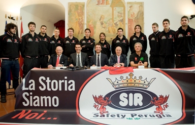 Nella splendida cornice della Sala della Vaccara del Comune di Perugia, si è svolta questa mattina la presentazione alle autorità cittadine della Sir Safety Perugia. Ad accogliere i bianconeri il primo cittadino Boccali, l’assessore allo sport del Liberati e il presidente regionale Fipav Lomurno. Alla presenza di televisioni e carta stampata, i Block Devils hanno così potuto fare la diretta conoscenza delle massime istituzioni di Perugia in un momento davvero emozionante per la società bianconera, presente al completo. Il ‘tavolo presidenziale’ comprendeva naturalmente anche il presidente del club Gino Sirci, visibilmente soddisfatto dell’accoglienza ricevuta dalle istituzioni cittadine, e l’allenatore bianconero Dall’Olio. Tutta la squadra (con l’eccezione del libero Prandi, assente giustificato) e lo staff tecnico e sanitario, dalla testa ai piedi ‘griffati’ Block Devils, hanno seguito l’evento seduti all’interno della sala e sono stati presentati al termine della conferenza uno ad uno proprio da Dall’Olio. Un momento di incontro particolarmente gradito dalla società bianconera conclusosi con le classiche foto di rito e con un brindisi beneaugurante. Questi gli interventi più significativi della conferenza.