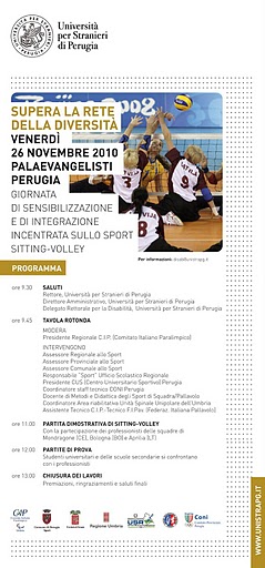 Mercoledì prossimo, 24 novembre, alle ore 11 nella Sala della Vaccara, si svolgerà una conferenza stampa per presentare la manifestazione ‘Supera la rete della diversità‘, in programma per venerdì 26 novembre al Palasport Evangelisti, dedicata alla disciplina del sitting volley. I contenuti e le motivazioni della giornata di sensibilizzazione e di integrazione saranno illustrati dall’assessore allo sport del Comune di Perugia, Ilio Liberati, dal presidente regionale del Comitato Italiano Paralimpico, Francesco Emanuele, e dal delegato del Rettore dell’Università per Stranieri per la disabilità, Ippolita degli Oddi.