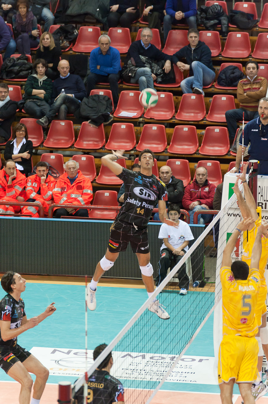 Non basta una combattiva Sir Safety Perugia per arrestare l’avanzata della forte Che Banca Milano. Una partita nella quale la squadra grifona ha dimostrato ancora una volta di avere le possibilità di competere con tutte, ma che per vincere manca ancora qualche cosa. E’ una sconfitta che peggiora ulteriormente il morale quella di sabato, ormai ogni occasione deve essere buona per rosicchiare punti e non esserci riusciti significa aver perso una possibilità. In questa occasione il tecnico Fant ha mischiato spesso le carte del suo mazzo per sopperire alle lacune fisiche di alcuni elementi. Gli equilibri sono però risultati sempre labili ed i lombardi hanno trovato la maniera per espugnare il Pala-Evangelisti. La squadra del presidente Gino Sirci, ancora priva di Hietanen, aggredisce sin da subito e costringe gli ospiti a rincorrere, ma alla fine sono i lombardi a sorridere. In avvio rompe subito gli indugi Milano che conquista un leggero margine sui precisi affondi di Robbiati (6-8). In seconda linea entra Fusaro che con la sua precisione consente alla regia di mandare a segno i compagni ed infiamma il pubblico del Pala-Evangelisti (17-14). I padroni di casa giocano bene, si esaltano a muro e tolgono il coraggio ai lombardi (23-19). Sembra tutto facile quando una pausa inconcepibile permette a Milano di recuperare in extremis (24-24). Il muro di Mattera sigla il sorpasso (25-26). A risolvere ci pensa Dokic che sigla l’attacco finale sfruttando le battute al fulmicotone di Saitta (miglior realizzatore della squadra con 4 punti nel parziale). Al cambio di campo c’è subito un tentativo di strappo degli ospiti che grazie all’onnipresente Janusek si portano sul 6-8. Perugia non si scompone in ricezione ed il generoso Saitta permette di non perdere fiducia nei propri mezzi (15-15). E’ ancora un Di Manno scatenato a far ripartire Milano (18-21). Fant getta nella mischia Serafini e Ranghieri che con due buone giocate riducono il gap (21-22). Nel finale ci sarebbe la possibilità di impattare ma una decisione avversa contestata da tutti consente a Milano di salvarsi e di andare a pareggiare i conti. Nella terza frazione i bianconeri confermano capitan Serafini in regia e Ranghieri (ultima partita per lui che andrà con la nazionale di beach volley all’estero per sei mesi). Di Manno è sempre molto incisivo e non spreca nulla (5-8). E’ proprio Ranghieri il punto di riferimento della regia che lo sfrutta a dovere per ritornare in pista (10-10). I settentrionali ripartono e guadagnano tre lunghezze di margine grazie anche a decisioni arbitrali favorevoli, ma la Sir Safety è in agguato e con un ispirato Barbareschi mette il naso avanti (16-15). Dura poco però perché Janusek riesce a far pendere l’ago della bilancia dalla parte dei lombardi (18-21). Nessun sussulto sino all’errore che regala il vantaggio agli ospiti. Nella quarta frazione Fant ridisegna l’assetto, fiducia a Lattanzi nel ruolo di schiacciatore al posto di Rigoni. Milano parte a razzo e sopravanza di quattro lunghezze i perugini (1-5). Non c’è più la stessa grinta negli occhi del collettivo locale e Milano ne approfitta per allungare (7-13). I ragazzi del presidente Gino Sirci mostrano qualche buono spunto col solito Ranghieri che tira fuori dal cilindro soluzioni in grado di accorciare le distanze (13-15). Barbareschi riesce addirittura ad impattare sul 18-18. Gli umbri tornano a soffrire le incursioni dell’onnipresente Di Manno che mantiene la regolarità (19-22). Di Manno sancisce la fine dei giochi con un attacco vincente. Qualche progresso si vede ma c’è la sensazione che Perugia stia provando troppe soluzioni senza ottenere una continuità.