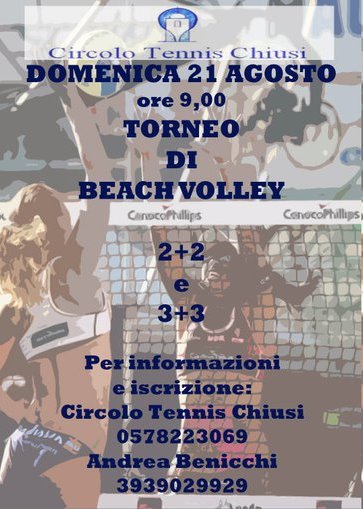 Si svolgerà sabato 20 e domenica 21 agosto il torneo di beach volley organizzato per il secondo anno consecutivo dal ‘Circolo Tennis Chiusi’. Il torneo che si disputerà sul campo in sabbia adiacente il palazzetto dello sport, in località Poggio Gallina a Chiusi, sarà diviso in due categorie, 2×2 open maschile e 3×3 misto. In quest’ultimo si prevede un solo tesserato uomo Fipav per squadra. Per info e iscrizioni 0578-223069 oppure 393-9029929.