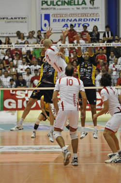 La Bcc-Nep Castellana Grotte passa sul campo della Gherardi Svi Città di Castello al termine di un incontro emozionante che ha visto le due squadre darsi battaglia a suon di schiacciate in campo e le due tifoserie, correttissime, incitare i sestetti ininterrottamente per due ore e mezzo. La vittoria degli ospiti accorcia nettamente la classifica che ora vede Loreto in testa imbattuta con nove punti e Segrate e Città di Castello dietro con gli stessi punti. Le due squadre scendono in campo con i sestetti annunciati: Radici conferma il 6+1 che ha sbancato Santa Croce mentre Di Pinto, neo tecnico ospite, sceglie Milushev in diagonale con Falaschi e Castellano in posto quattro, al centro gioca Giosa per l’indisponibilità di Salgado. Il primo break lo firma Lehtonen a muro (3-1) ma i pugliesi tornano sotto (4-4) ma al primo time-out tecnico la Gherardi Svi conduce 8-6 grazie a un errore di Rodriguez in attacco, bissato per la palla del 10-7. Quando l’attaccante spagnolo spara out la terza palla, Di Pinto chiama time out (12-8). I quattro punti conquistati nella fase centrale del set vengono aumentati prima della seconda interruzione tecnica, ancora per un errore in attacco dei ragazzi di Castellana, questa volta di Milushev (16-11). Di Benedetto firma a muro su Milushev il 18-12 e capitan Rosalba intuisce il possibile pallonetto di Falaschi e spedisce gli ospiti dietro di sette lunghezze (19-12). Sul 19-13 Di Pinto tenta la carta Cazzaniga che consente ai suoi di accorciar le distanze fino al 19-15 ma Giombini ottiene il 21-16 tirando forte sulle mani del muro ospite e Lehtonen mette a terra un altro muro (22-16). Il martello anconetano chiude, da difficile posizione, anche la palla del 23-17 e Noda Blanco guadagna sei palle set: lo stesso giocatore spara out il servizio e nell’azione successiva Milushev fa lo stesso (25-19). I ragazzi di Di Pinto iniziano il secondo set con maggiore spinta (1-3) e provano a scappare via al primo time out tecnico sospinti dai servizi di Castellano (4-8). I tifernati cercano di stare nel set ma si trovano di fronte una BCC-NEP molto attenta (6-12) che non lascia grossi margini di ritorno alla GHERARDI SVI. Andrea Radici chiama time out (9-17) ma nell’azione successiva Giombini è murato da Elia ed allora il coach biancorosso gli dà un po’ di respiro ed inserisce Vigilante e poi anche Piano per alzare il muro. La squadra di casa recupera (13-18) e così il ‘mago di Turi’ chiama time out. Entra anche Dordei al servizio e sigla subito l’ace (15-19, primo punto in serie A per lui) ma Castellana riparte (15-21) con l’attacco di Rodriguez. Ci prova ancora Città di Castello con Giombini (18-23), Noda Blanco annulla la prima palla set degli ospiti (19-24) che pareggiano i conti con Castellano. Si riparte nel terzo set con una battaglia vera e propria e con Milushev che continua a martellare (3-5) e Noda Blanco gli risponde da par suo (6-6). Rodriguez fa il break dell’8-10 e sul 9-12 Andrea Radici chiama subito l’interruzione per bloccare l’avanzata dei pugliesi che mettono a segno l’ace del 9-13. Al secondo time out tecnico la formazione di Vincenzo Di Pinto conduce (12-16) e va anche sul 13-18 grazie ad un Milushev in grandissimo spolvero. Il servizio degli ospiti fa male alla ricezione di Città di Castello (ace di Cazzaniga per il 16-22). Piano, in campo per Di Benedetto mura Castellano (17-23) ma poi sbaglia il servizio che dà sette palle set ai pugliesi; una palla spinta di Giosa frutta l’1-2. Il quarto set inizia con Piano in campo al posto di Di Benedetto tra i biancorossi. Visentin si fa subito sentire a muro su Castellano (4-2) e serve due palloni d’oro a Rosalba che li trasforma in punti (6-3). Dopo il primo time out tecnico (8-5) la BCC-NEP rientra a contatto (8-7), la ricaccia indietro un muro punto di Giombini su Milushev (10-7). Un’incomprensione dei tifernati riporta in parità la contesa (10-10) poi una topica di Florian (tocco non visto sulla schiacciata di Rosalba) manda avanti gli ospiti (12-13). Ci pensa Leondino Giombini a dare un punto di vantaggio a Città di Castello con un muro a uno su Rodriguez (16-15). Noda Blanco tira l’ace del 20-18 e poi la partita si scalda dopo un errore di Milushev che causa le veementi proteste di coach Di Pinto, sanzionate con il cartellino giallo del 24-20. Cazzaniga va in campo sul 24-21 e porta i suoi sul 24-22 ma nell’azione successiva è vincente il mani out di Giombini (ancora con tante proteste ospiti). Il primo punto del quinto set è di Milushev, il secondo di Rodriguez (0-2), è il capitano Rosalba a trovare le mani del muro per l’1-2. Il bulgaro di Castellana è incontenibile (2-4) ma Giombini gli risponde (3-4) e Di Pinto chiama subito time out. L’interruzione serve a deconcentrare i ragazzi di Radici che non trovano la misura dell’attacco e si trovano sotto nettamente (3-8 al cambio di campo). Città di Castello non ci sta però e Noda Blanco dal servizio e Lehtonen a muro riavvicinano i tifernati (6-8) che sono riallontanati ancora da Milushev (8-11). Rodriguez sigla l’8-12 e sul 9-12 Andrea Radici tenta la carta Dordei in battuta ma è ancora lo schiacciatore spagnolo a regalare il punto numero 13 ai suoi. Sul 10-14 ci sono quattro palle match per Castellana che chiude con Castellano.
