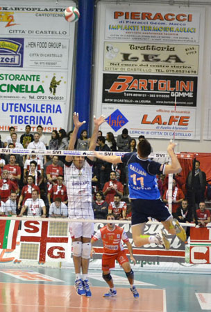 L’anticipo televisivo è della Gherardi Svi Città di Castello che batte nettamente la Cassa Rurale Cantù che ha retto l’assalto biancorosso solo nel primo set. Nel resto delle frazioni è stato dominio tifernate e la squadra di Radici ha chiuso la gara con i due ’95 in campo, Cherubini e Sartoretti, e col grande intramontabile Claudio Nardi. Nella giornata delle malattie rare (striscione esposto dalle due squadre prima dell’inizio della partita, allenatori e staff con le spillette al bavero della giacca e raccattapalle con pettorina), Città di Castello e Cantù scendono in campo con i sestetti annunciati, dato che Giombini, fermo nel terzo e quarto set a Roma, ha pienamente recuperato dal dolore al gomito. Si comincia con un minuto di raccoglimento in memoria dei militari italiani deceduti in un incidente stradale in Afghanistan. La prima palla è giocata da Tuominen che sbaglia il servizio, risponde Galliani dalla zona due (1-1). Cantù sorpassa con Ruggeri (2-3) dopo una palla toccata a muro da Pavan, Lehtonen si incarica di contro sorpassare con un ace (5-4). E’ Tuominen che riporta avanti la Cassa Rurale (5-6) ma al primo time out tecnico Rosalba manda avanti i padroni di casa (8-7) con un gran diagonale dei suoi. Sul servizio di Piano, la difesa di Noda Blanco consente la rigiocata di Giombini per il 10-8 poi capitan Rosalba mura Galliani (11-8). Un ace sporco di Monguzzi e un errore di Lehtonen consentono agli ospiti di pareggiare (11-11). Scattano ancora i tifernati con Noda Blanco e Giombini (15-12) e alla seconda interruzione tecnica è ancora lo spagnolo a sparare una terrificante diagonale vincente (16-13). La Cassa Rurale non ci sta ancora (16-15, punto di Tuominen) e parità con Galliani. Un errore di Tuominen ricaccia ancora indietro i lombardi (18-16) che subiscono l’ace di Noda Blanco del 20-17 (time-out Della Rosa) che doppia per il 21-17. Un errore di Bonetti regala alla squadra di Radici il 23-18, il muro di Giombini e Lehtonen dà sei palle set ai tifernati. Vigilante fallisce il servizio, Rosalba non sbaglia la palla dell’1-0 (25-19). Subito avanti 3-1 i biancorossi nel secondo set e 4-2 col muro di Giombini che sigla anche il 5-2 dopo una bella difesa di Noda Blanco. Poi ci pensa Lehtonen ad allargare ancora il gap con un muro stratosferico (7-3), lo spagnolo spara il diagonale dell’8-4. Piano dimostra di non temere il confronto con Pavan e lo mura per il 9-4. Sull’11-5 dopo un errore di Galliani dalla seconda linea, coach Della Rosa richiama i suoi in panchina e fa ancora lo stesso sul 13-6 dopo un’altra palla out dell’opposto. Un muro di Pavan e Galliani riavvicina la squadra di Della Rosa (14-10) che accorcia ancora con l’ex sorano (14-11) che poi sbaglia grossolanamente (15-11). E’ ancora una bomba dalla seconda linea di Giombini a spedire le due squadre al secondo time out tecnico sul 16-11. L’attacco di Rosalba e l’ace di Giombini allontanano Cantù (18-12) che sostituisce Krumins con Gerosa. Lehtonen è in grande condizione in attacco (21-14), poi Tuominen riavvicina la Cassa Rurale (21-18) che usufruisce anche di un paio di errori della squadra di Radici. E’ ancora una volta il capitano Rosalba con due punti ad avvicinare al traguardo gli umbri (24-20) che chiudono il set ancora con la diagonale del giocatore calabrese (25-21). Anche nel terzo set la partenza della Gherardi Svi è veemente con Lehtonen e Giombini (5-2). Ci pensa poi Sergio Noda Blanco a siglare il 6-2 e a costringere Della Rosa al time out. Alla prima sosta tecnica i tifernati sono nettamente avanti (8-4, altro punto di Noda Blanco), un errore di Ruggeri allarga ancora il gap (10-5). Quando lo spagnolo spara la pipe del 12-5, l’allenatore ospite ferma il gioco. Sul 12-6 coach Radici inserisce Di Benedetto per Piano ma la Cassa Rurale sembra ormai in disarmo; Giombini spara un ace per il 15-6, l’attacco out di Galliani dalla seconda linea manda le due squadre al secondo time-out tecnico (16-6), mentre la ‘Curva Nord Seconda Giovinezza’ già pregusta il 3-0 finale. Uno splendido pallonetto di Visentin porta sul 18-8 i padroni di casa ed allora Andrea Radici regala qualche scampolo di partita anche a Vigilante e Dordei mentre Della Rosa aveva, qualche attimo prima, di nuovo sostituito Krumins con Gerosa. Di Benedetto entra nello score con il 21-10, vanno poi in campo anche Cherubini in palleggio per Visentin e Sartoretti per Giombini. Il giovane alzatore tifernate serve subito un bel primo tempo a Di Benedetto (22-11) che mura Galliani per il 23-12. Gerosa sbaglia la palla del 24-12 e sul 24-12 anche Claudio Nardi rileva Romiti. Il punto finale è proprio del giovane Sartoretti.
