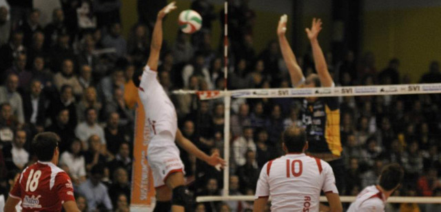 Una battaglia fino all’ultimo punto viene vinta dalla Gherardi Svi Città di Castello, capace di rimontare dall’uno a due e di chiudere una partita incredibile. Va in campo il sestetto annunciato per i tifernati mentre Nacci sceglie De Giorgi in avvio come alzatore al posto di Kindgard. Il maltempo non tiene lontani i tifosi tifernati che gremiscono come sempre il Pala-Ioan. La prima battuta è di Corigliano, il primo punto è di Giombini (1-0) poi va in battuta Piano ed i biancorossi infilano subito altri tre punti: il secondo di Lehtonen a muro su Tomasello, il terzo e il quarto di Rosalba. Nacci chiama subito time-out ma al rientro Giombini pizzica il muro ospite per il 5-0. E’ l’australiano Edgar a mettere a terra la prima palla per gli ospiti (5-1) ma Lehtonen rimette le cose a posto (6-1). Tomasello e Spescha accorciano le distanze (6-3) poi lo stesso ex cuneese commette invasione a rete e così al primo time-out tecnico gli umbri si mantengono cinque punti avanti (8-3). La squadra di Radici continua a giocare bene, Noda Blanco spara a terra la ricostruzione dell’11-5 con un attacco da posto quattro, Giombini e Piano fermano Galic a muro per il 13-6, fa lo stesso Rosalba con Edgar (14-6) e secondo time out di Nacci. Una palla out dei tifernati regala ai calabresi il 14-8, Noda si riscatta con una terrificante pipe (15-8) e l’errore di attacco di Edgar porta le due squadre al secondo time out tecnico sul 16-8. Padura Diaz, in campo per Edgar, commette subito un errore, preludio a un’altra doppietta a muro dei padroni di casa con Giombini e Lehtonen (19-8). Il delizioso lungolinea di Rosalba porta sul 21-9, il capitano bissa con la diagonale del 22-10. Il set finisce in scioltezza per i ragazzi del presidente Arveno Ioan dopo la battuta sbagliata del neo entrato Santucci che dà dodici palle set; Tomasello e Sperandio ne annullano due, la terza è trasformata da Noda Blanco (25-14). Il secondo set si apre con un miracolo di difesa di Romiti trasformato in punto ancora da Rosalba, Giombini doppia dopo un’altra difesa di Noda Blanco (2-0), Piano Inchioda Edgar ed allora Nacci cambia alzatore, gettando nella mischia Kindgard. Non serve a nulla, Rosalba è incontenibile (4-0 e time out Nacci). Il primo punto ospite viene da un servizio sbagliato dalla Gherardi Svi (5-1) che subisce poi un parziale di 0-2 con Sperandio (3-5). Al primo time out tecnico la squadra di casa è però sotto 7-8 dopo un turno in battuta redditizio da parte di Sperandio. Pareggia Lehtonen e Giombini riporta avanti i suoi (9-8). Spescha mette out il 10-8, Kindgard Riagguanta la Gherardi Svi con un pallonetto dopo un’azione lunghissima. Comincia un testa a testa, rotta da una palla di Galic che gli arbitri giudicano, erroneamente, non toccata (15-13). Spescha si incarica di pareggiare ancora a quota 15, un errore di Lehtonen consente ai calabresi di andare sul 15-16 al primo time-out tecnico. Giombini non trova la misura dell’attacco (16-18) e così Andrea Radici ferma il gioco (16-19). Anche Lehtonen non passa (16-20) e altro time-out del coach biancorosso. Sul 18-22 Piano inchioda Edgar e questa volta è Nacci a fermare il gioco, mossa che sortisce l’effetto sperato (20-24). Piano annulla la prima palla set per gli ospiti, Edgar chiude e pareggia (21-25). Nel terzo set il Caffè Aiello riparte benissimo, sulla falsariga del finale del secondo e conduce di due lunghezze in avvio (2-4) ed anche alla prima interruzione tecnico (6-8). La partita diventa una battaglia, anche perché Edgar è salito molto di tono, dopo un deficitario primo set. L’australiano pizzica il muro tifernate (10-11) e poi Galic piazza un ace (10-13) prima che Sperandio regali il 12-13 con un attacco out. Alla seconda interruzione del terzo set gli ospiti sono avanti 13-16 poi il turno in battuta di Edgar apre un nuovo gap a favore della squadra ospite (13-18). Tre belle azioni dei locali riavvicinano Rosalba e compagni (16-18), ricacciati indietro dal pallonetto di Galic e dall’errore di Lehtonen (16-21). Il finale di set è ancora targato Caffè Aiello, soprattutto per la buona vena di Galic che mette a terra il 16-22. In questa fase Andrea Radici avvicenda Giombini con Vigilante che però fallisce l’attacco (17-24). Piano schiaccia il 18-24 poi la battuta sbagliata dai tifernati manda avanti Corigliano di un set (18-25). Una difesa di Romiti e un muro di Visentin danno il primo vantaggio del quarto set alla Gherardi Svi (4-2), che si porta sul 6-3 con Giombini, al termine di una grande azione. Lo slash di Lehtonen porta sull’8-4 il risultato, Galic accorcia le distanze con una pipe (9-7) e la partita è ancora una battaglia. Tomasello commette fallo di invasione (11-8) poi è Rosalba a scavare un solco importante. Entra Di Benedetto per Piano e subito si fa vedere a muro col 17-12 e con il 20-13. Sembra di rivedere il primo set perché i coriglianesi sbagliano tanto e Città di Castello tiene bene il campo, soprattutto col cambio palla. Sale in cattedra Noda Blanco con due palle a terra di fila (23-14), sul suo servizio Giombini guadagna dieci palle set, lo stesso spagnolo spara l’ace del 25-14. Quinto set inizia con un errore in attacco dei tifernati e con uno di Edgar (1-1). Giombini inchioda Galic (2-1), Rosalba fa lo stesso con l’australiano che viene messo in panchina da coach Nacci, al suo posto Padura Diaz (3-1). Giombini pizzica le mani del muro calabrese (5-3), Padura Diaz attacca in campo (5-4) e un altro errore dei tifernati regala la parità. Ci pensa ancora il muro biancorosso, Giombini-Di Benedetto, a riallungare al cambio di campo (8-6). Un errore dei tifernati riporta la situazione in parità (8-8), Galic sorpassa (8-9). Sul 10-10 c’è un giallo per entrambe le panchine e quindi si va sull’11-11. Dopo una lunghissima interruzione, Giombini sbaglia la battuta (11-12), Rosalba tira fuori dal cilindro l’incredibile diagonale della parità. Spescha non sbaglia il 12-13, lo stesso fa Giombin