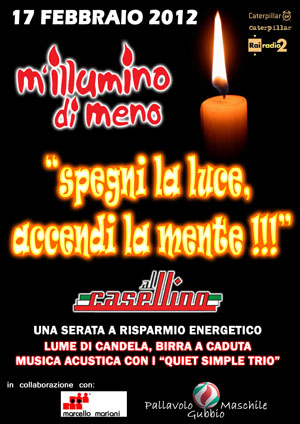 Ancora una volta i ragazzi della Pallavolo Gubbio sono al centro dell’attenzione anche fuori dal rettangolo da gioco. Gli atleti della squadra maschile hanno messo in pista una iniziativa utile con la collaborazione del ristorante pizzeria Al Casellino e dell’attività commerciale Marcello Mariani che contribuisce con le candele per tutto il locale. Come tutti gli anni la squadra maschile partecipa a ‘M’illumino di meno’ nella giornata di venerdì 17 febbraio. A parlarne è uno dei promotori Luigi Rosetti che si mostra orgoglioso: «In questa occasione al grido di ‘Spegni la luce, accendi la mente’ abbiamo deciso di giocare una partitella a fari spenti con le luci a led del tipo da minatore in testa, inoltre installeremo in palestra dei contenitori di raccolta plastica per le bottiglie utilizzate da tutti gli sportivi che frequenteranno il luogo. Per il proseguo della serata abbiamo coinvolto il Ristorante Al Casellino e organizzeremo una serata a risparmio con illuminazione a lume di candela, musica dal vivo completamente in acustica (senza uso di casse) e birra a caduta direttamente dalla botte (senza l’uso di spinatori che tanta energia elettrica consumano). I camerieri e lo staff composto anche dalla nostra squadra girerà con le luci in testa e i braccialetti luminosi. Inoltre su ogni tavolo ci sarà il decalogo del risparmio energetico. Candele (gentilmente offerte da Marcello Mariani) sui tavoli per far luce». E’ il terzo anno consecutivo che gli sportivi eugubini delle schiacciate partecipano all’iniziativa che riguarda tutto ciò che è risparmio ambientale e quindi abbraccia anche il discorso dei contenitori della raccolta differenziata, occasione colta al volo per unire utile al dilettevole. Va sottolineata ancora una volta la grande sensibilità del gruppo rossoblu che è sempre pronto a sostenere le cause nobili come quella del risparmio energetico. Una squadra che si caratterizza per il grande affiatamento, l’amicizia e l’attaccamento alla maglia. Chiunque voglia partecipare alla serata può farlo semplicemente recandosi al ristorante Al Casellino.