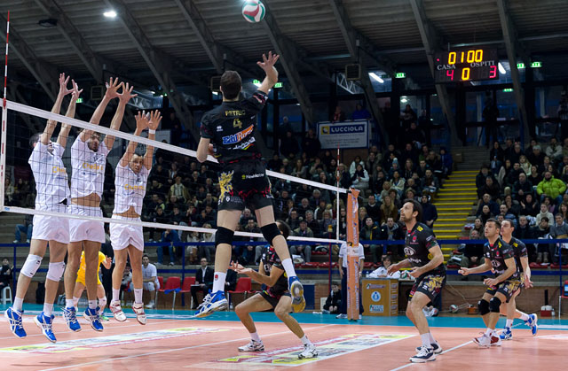 Sesta vittoria consecutiva per la Sir Safety Perugia che, in un Pala-Pellini traboccante di entusiasmo (nonostante il clima ostile di questa domenica perugina) e di tifosi, supera nettamente in tre set la Che Banca! Milano e rimane da sola in vetta alla classifica. Prestazione maiuscola dei block-devils, guidati alla perfezione in panchina da Kovac, che hanno sempre condotto le danze nei tre parziali disputati, trovando continuità nel primo attacco e lavorando come al solito in modo impeccabile nella fase break. La splendida cornice di pubblico presente nello storico palazzetto dello sport di via Pellini ha potuto lustrarsi gli occhi di fronte ad un sestetto che gioca a memoria, sbaglia pochissimo e sa imporre il suo ritmo di gioco. Tamburo e Petric hanno furoreggiato in attacco su palla alta, ben coadiuvati dai due centrali Tomassetti e Corsini, bravissimi in primo tempo ed a leggere il gioco velocissimo di Milano. Con capitan Vujevic concreto in ogni angolo del campo, vanno però menzionati Daldello e Cesarini. Il primo è stato eccellente direttore d’orchestra, smarcando a più riprese i suoi frombolieri con alzate sempre precise, il secondo è stato a dir poco formidabile in seconda linea, sia in ricezione, sia nelle innumerevoli difese. Milano al contrario è incappata in una giornata storta, soprattutto nella gestione dell’errore. 29 i punti ‘regalati’ agli avversari, troppi per provare a portar via punti, nonostante i cambi operati da Moretti e senza nulla togliere alle qualità di una squadra che presenta un ottimo regista come Mattera e due martelli di qualità come Vedovotto e Raphael, sicuramente i più positivi della Che Banca. Con questi tre punti la Sir conserva, come detto, il primato in classifica. Domenica prossima, dopo la parentesi del ‘Pellini’, si torna al Pala Evangelisti. Arriva Santa Croce per un altro incontro difficile, da affrontare al massimo. Certo è che questa Sir fa davvero sognare… Sestetto annunciato al via per Perugia. Milano presenta invece Robbiati al centro e Cauteruccio libero in luogo rispettivamente di Insalata e Durante. Il primo break è della Sir con Petric e Tamburo incisivi in attacco (6-3). Un paio di fischi dubbi del primo arbitro Bertoletti consentono a Milano di rientrare (7-6), ma ci pensa ancora Petric in pipe a mandare le squadre al primo timeout tecnico (8-6). I block-devils tengono il vantaggio sempre con gli attacchi vincenti del duo Tamburo-Petric ed un muro di Corsini dà il +4 ai padroni di casa (14-10). Un attacco giudicato out di Enzo Di Manno costringe coach Moretti a fermare il gioco sul 17-12 Perugia. Un nuovo errore dell’opposto porta al cambio con l’ingresso del magiaro Baroti. Finezza di Vujevic per il 19-12, mentre nella metà campo ospite fa il suo ingresso anche l’ex Mercorio. Proprio Baroti viene fermato da un imperioso Tomassetti a muro ed è 21-14 Sir. L’ace di Daldello vale il 23-15. È l’errore di Baroti a chiudere il parziale (25-16). Equilibrio alla ripresa del gioco. È il turno al servizio di Tamburo (con un ace) a dare il primo break ai suoi (6-3). Vujevic tira una diagonale stretta delle sue ed alla prima pausa obbligatoria i Block Devils sono ancora avanti (8-5). Milano commette qualche errore di troppo in attacco e Moretti deve ancora chiedere timeout con la Sir avanti 13-7. Al rientro in campo due muri consecutivi degli ospiti, uno di Raphael ed uno di Mattera, li riavvicinano nel punteggio (13-10). Sono però ancora gli errori gratuiti della Che Banca! ad allargare nuovamente la forbice (16-11). I bianconeri dal canto loro tengono bene in primo attacco e trovano il muro spettacolare di Petric si Di Manno che vale il 21-16. Un gran servizio di ‘Spacca’ Tamburo porta la Sir sul 24-18. Chiude un curioso punto di Petric direttamente dalla ricezione (25-19). Il terzo set vede subito i block-devils mettere il naso avanti, sfruttando un paio di errori diretti avversari (3-1). Petric va a bersaglio in contrattacco (6-3), imitato qualche scambio dopo da Daldello che, di seconda intenzione, forma l’8-4. Il gioco dei padroni di casa si mantiene fluido con i centrali Tomassetti e Corsini sugli scudi. Proprio ‘Tarzan’ Corsini ferma a muro la pipe di Vedovotto per il 15-10 Sir. Milano prova la rimonta con un positivo Raphael (20-17), ma è una doppietta di Petric a ristabilire le distanze (22-17). Corsini in primo tempo porta al match-point (24-19). Chiude un servizio imprendibile di ‘Drago’ Petric (25-19).