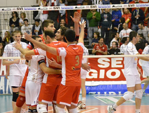 E’ semifinale, per il secondo anno di fila per la Gherardi Svi Città di Castello. Gli umbri vanno avanti, soffrono il ritorno dei milanesi e dominano poi il quinto set. Grande prova di tutto il sestetto biancorosso ma una menzione la meritano uno straordinario Noda Blanco (27 punti con 70% in attacco) e Jukka Lehtonen (13 punti ed 89% in attacco). I padroni di casa vanno in campo col sestetto annunciato mentre la Che Banca Milano schiera Cauteruccio nel ruolo di libero e Baroti opposto in luogo di Di Manno, al centro Robbiati sostituisce Insalata, infortunato di lungo corso. La prima battuta è dei lombardi con Beretta, il primo punto è di Rosalba. E proprio il capitano firma il primo break (3-1) dopo una gran difesa biancorossa, Noda Blanco chiude due palle consecutive in attacco, la seconda difficilissima, per il 6-3. Al primo time-out tecnico i tifernati sono avanti per 8-5 grazie all’errore al servizio di Raphael. I milanesi si riportano sotto con un buon turno al servizio di Beretta (8-7), li ricaccia indietro ancora Rosalba (11-9). Prosegue il punto a punto fino alla parità ottenuta da Beretta a muro (13-13), il sorpasso ospite arriva da un errore di Noda Blanco (14-15). Ma alla seconda sosta tecnica va avanti la squadra di casa con un imperioso muro a uno di Giombini su Vedovotto (16-15). Con i biancorossi sempre avanti di due punti (19-17), coach Fumagalli chiama il primo time out discrezionale perché i suoi ragazzi hanno sbagliato due battute di fila, il rientro in campo porta un altro punto per i tifernati con il mani out di Giombini e altro time out di Milano (20-17). L’ace di Lehtonen su Raphael garantisce ben quattro punti di vantaggio alla squadra di Radici (23-19), che è riavvicinata dal muro di Baroti (23-21). Radici ferma il gioco e Noda Blanco sfonda il muro di Baroti e Beretta e si assicura tre palle set: Raphael annulla la prima con un attacco e la seconda con un ace (24-23) e altro time out tifernate. Giombini dalla zona quattro non fallisce la palla dell’1-0. Alla fine del primo set la curva ‘Seconda Giovinezza’ rende omaggio ancora a Vigor Bovolenta, con una sua foto e la scritta “Ciao Bovo”: tutto il Pala-Ioan si alza in piedi per applaudire. La prima fase del secondo set vede le due squadre rincorrersi (4-4), al primo time out Città di Castello conduce con il punto di Matteo Piano (8-7). Sul 9-7 coach Fumagalli toglie Baroti e mette in campo il grande ex Enzo Di Manno ma Noda Blanco con un ace e una pipe lancia la Gherardi Svi sul 12-8. Un altro ace, contestato da Che Banca, di Giombini costringe Fumagalli al time out (14-9). Di Manno sbaglia l’attacco del 16-10, Raphael lo imita (tra le proteste) e così Città di Castello va sul 18-11. Lehtonen è ancora devastante dalla zona uno (20-11) poi Beretta mura il neo entrato Di Benedetto (20-13). Noda Blanco frustra il tentativo di rientro di Che Banca con la palla del 22-15 ed è poi Jukka Lehtonen a murare Di Manno e a mettere il sigillo alla frazione (25-17). Terzo set inizia con Baroti e Mercorio di nuovo in campo in maglia Che Banca al posto di Di Manno e Raphael. Mercorio, il cui ingresso serve anche a sistemare la ricezione, mette a terra due palloni di fila per l’1-3, Baroti lo aiuta con la palla del 2-5. Beretta sbaglia il servizio del 4-6 ma Baroti non sbaglia la palla del 4-8. Gioca bene ora la squadra ospite che ha messo a posto alcuni fondamentali e va sul 6-11 con Vedovotto. Fatica Città di Castello in questo frangente che, tuttavia, si avvicina con i muri di Lehtonen (10-13) e l’ennesima palla da antologia del volley di Rosalba dopo un recupero miracoloso di Noda Blanco (12-14). Al secondo time out tecnico la squadra ospite è avanti (13-16) e prende il largo (15-19 e time out Radici). Noda Blanco si porta poi al servizio e spara due ace che riportano sotto Città di Castello (18-20), fuoco di paglia perché Vedovotto riporta Milano sopra di quattro (18-22). Mattera fa un miracolo per la palla del 20-24, Rosalba annulla, decide Baroti. Subito avanti Che Banca con Baroti nel quarto set (1-3), due errori consecutivi di Robbiati portano avanti i locali che conducono 8-7 al primo time out tecnico. Ora è battaglia vera e propria in campo, in ogni fondamentale. Mattera trova spesso Baroti (9-10), poi Beretta mura per il 9-12. La squadra ospite difende alla grande e Città di Castello è costretta a giocare con grande pazienza per fare punti. Sergio Noda Blanco mette a terra due attacchi consecutivi (13-14) ma Mercorio mura Giombini (13-16) e Vedovotto sigla un ace (13-17). I tifernati non riescono a tornare a contatto con Milano che va in fuga (13-18). Un muro di Piano su Baroti e un attacco out di Mercorio portano il punteggio sul 16-19. Niente da fare, è ancora Mercorio ad allontanare gli umbri (16-20). Gli ospiti veleggiano tranquilli, ma Noda Blanco e un errore rimettono in corsa i tifernati che pareggiano a quota 24. Vedovotto schiaccia il 25-26, Robbiati rimanda il verdetto al quinto set. Rosalba apre il quinto set (1-0), una palla contestata di Mercorio pareggia (1-1). Sul servizio di Giombini, pipe di Noda Blanco per il 3-1 e muro di Visentin per il 4-1. Un altro grave errore arbitrale frutta il 4-2 di Milano, poco male perché Noda Blanco è implacabile e sigla il 6-2. Baroti sbaglia la battuta (7-3) poi viene murato da Piano (8-3 e cambio campo). Dopo un’altra doppietta biancorossa firmata da un monumentale Noda Blanco e da Giombini a muro (10-4), Fumagalli chiama time out. Due errori consecutivi di Baroti mandano Città di Castello sul 12-5, Giombini spara il 13-5, Rosalba guadagna otto palle match, il muro di Lehtonen fa esplodere il Pala-Ioan.