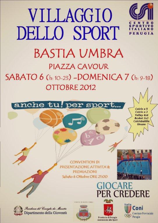 Il Centro Sportivo Italiano presenta nei giorni sabato 6 e domenica 7 ottobre in piazza Cavour a Bastia Umbra, il progetto ‘Anche tu! Per Sport’ rivolto agli studenti delle scuole secondarie di secondo grado con l’obiettivo di orientarli verso la pratica quotidiana dell’attività sportiva, di promuovere sani stili di vita, l’individuazione delle migliori pratiche sulla gestione e promozione dell’associazionismo sportivo e scolastico e la crescita di una cultura sportiva individuale e collettiva. L’evento promosso dal Csi Perugia, declinato su due giorni coinvolgerà almeno 2000-3000 persone e prevede l’allestimento di un Villaggio dello Sport in cui saranno allestite diverse strutture mobili (tra cui due campi volley 4×4) dove saranno presenti diversi operatori. L’attività di allestimento e animazione presso le strutture sarà esclusivamente a carico del comitato provinciale perugino. Inoltre, nella serata di sabato 6 ottobre si svolgerà la convention di presentazione durante la la quale saranno illustrate le attività sportive e di formazione per l’anno 2012/2013 e saranno premiati i vincitori dei tornei primaverili della stagione appena conclusa.