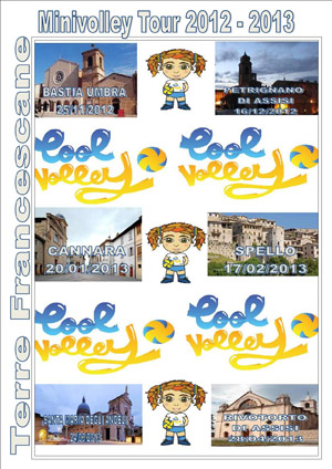 Minivolley Tour (volantino)Prende corpo l’iniziativa di alcune società che, rivolgendo grande attenzione ai propri settori giovanili, puntano ad un rilancio nel settore del minivolley attraverso un qualificato utilizzo di tecnici specializzati unito ad una consistente attività ludico-motoria. Le società che prendono parte al progetto denominato Minivolley Tour 2012-2013 – Terre Francescane sono sei ed operano su quattro comuni: Assisi (Assisi Volley – Volley 86 Petrignano – Rivotorto Volley), Bastia Umbra (Libertas Bastia), Cannara (Don Bosco Cannara) e Spello (Spello Volley). Queste società, pur disputando complessivamente una vasta gamma di campionati sia di serie che di divisione, anno dopo anno si propongono sempre di raggiungere l’obiettivo di un incremento di partecipazione nella disputa dei campionati giovanili congiuntamente ad un innalzamento della qualificazione tecnica ed unitamente alla valorizzazione degli aspetti sociali in ogni loro iniziativa. Ed il minivolley è la base solida su cui le società possono crescere le loro sane radici. Il minivolley è un grande momento di aggregazione per miniatleti e miniatlete animati da spirito sportivo  e tanta voglia di giocare per dimostrare la propria abilità, ma è anche un momento di vero spettacolo che riporta lo sport ai suoi valori fondanti: divertimento, impegno, amicizia, spirito di squadra, abilità, onestà, rispetto. I tornei ,articolati nel periodo novembre-aprile, impegneranno mediamente in ogni giornata circa 180 ragazzi e ragazze nella fascia 6-10 anni oltre ad altri 30-40 addetti tra allenatori e staff a garantire il perfetto funzionamento delle iniziative. Ad ogni tappa verranno invitate pure le direzioni didattiche competenti per territorio. L’attività verrà pubblicizzata anche attraverso l’utilizzo della dicitura ‘Cool Volley’ con relativa mascotte. Cool Volley è la denominazione utilizzata dalla Fivb per le attività di sviluppo e promozione in tutto il pianeta. Queste le date, i contatti e le informazioni del Minivolley Tour – Terre Francescane 2012-2013: il 25 novembre 2012 alle ore 15 al palazzetto dello sport di viale Giontella a Bastia Umbra (libertasbastia@libero.it); il 16 dicembre 2012 alle ore 15 alla palestra delle scuole medie Pennacchi a Petrignano d’Assisi (volley86@libero.it); il 20 gennaio 2013 in orario da confermare al palasport di Cannara (marcoloreti79@virgilio.it); il 17 febbraio 2013 alle ore 9 al palasport di Spello (fiorucci.f@pg.com); il 24 marzo 2013 alle ore 9 al palazzetto e alla scuola media di Santa Maria degli Angeli (assisivolley@gmail.com); il 28 aprile 2013 in orario da confermare al palazzetto di Rivotorto d’Assisi (mauro.lillocci@gmail.com).