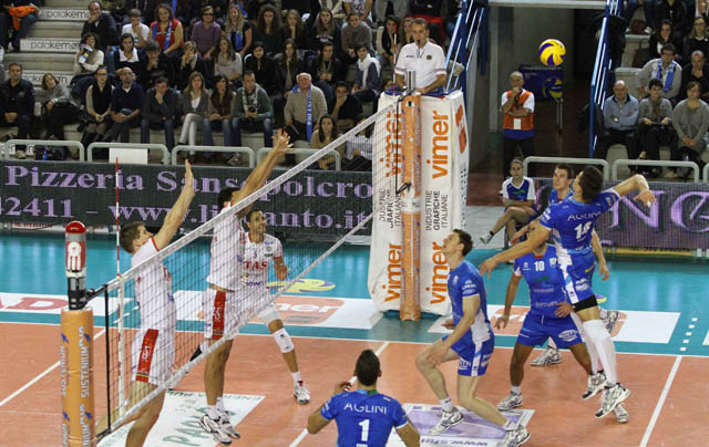 Nulla da fare per la Vivi Altotevere San Giustino. La Itas Diatec Trentino si conferma compagine di un altro pianeta e espugna il Pala-Kemon con un perentorio tre a zero. Gli umbri di coach Fenoglio hanno dato tutto per contrastare la squadra più forte del mondo, ma hanno dovuto cedere l’onore delle armi di fronte allo strapotere di Kaziynski (13), Juantorena (13 punti), Stokr e compagni. Bella l’atmosfera vissuta al palasport con le due tifoserie gemellate ed unite nella stessa curva. Inizio di partita equilibrato (6-6) poi Trento allunga (9-13) grazie ai due errori di Van Den Dries e all’ace realizzato da Juantorena. I campioni del mondo gestiscono con autorevolezza la seconda parte del set e tengono a distanza di sicurezza San Giustino. Il parziale si chiude con la battuta punto di Kaziynski e con 6 lunghezze di distacco in favore di Trento (19-25). San Giustino parte meglio nel secondo set (4-2), ma poi subisce la prepotente rimonta della squadra ospite (4-8) e non riesce più a tenere il passo (7-16). Gli ospiti girano a mille e fanno valere il loro superiore tasso tecnico, gli altotiberini pagano i troppi errori soprattutto in difesa. Il sestetto di Stoytchev vola soprattutto grazie al servizio (cinque ace nel set) e chiude il parziale sul 12 a 25. Decisamente più equilibrato il terzo set. Altotevere San Giustino prova a scappare con i 3 vincenti di Van Den Dries (4-1), la Itas Diatec raggiunge la parità grazie al perfetto servizio firmato da Stokr (7-7). Gli umbri restano attaccati al match e l’equilibrio va avanti fino alla parte più calda del set. Cebulj trascina San Giustino, De Togni firma l’ace del 19-19, poi è l’errore di Stokr a dare al team di Fenoglio il punto del 20-19. Il pubblico di casa ci crede, ma la reazione dei campioni del mondo è veemente. Kaziynski guida l’Itas nel momento cruciale della gara e chiude il conto (23 a 25) con l’ennesimo attacco vincente. Il libero Andrea Cesarini afferma: «Noi ce l’abbiamo messa tutta, ma l’Itas Diatec Trentino si è dimostrata troppo forte.. Loro hanno giocato su livelli altissimi e ci hanno messo sotto pressione fin dal servizio. Speravamo di vincere un set, ma non ci siamo riusciti. Dopo un inizio di torneo difficilissimo, da domenica prossima comincia un altro campionato».
