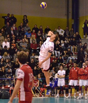 Nella giornata delle 100 partite di Rosalba con la maglia biancorossa, la Gherardi Svi Città di Castello si riprende la vetta della serie A2 maschile, ceduta per una notte ad Atripalda. Ad inizio partita il capitano Simone Rosalba è stato premiato dal presidente Arveno Ioan con una targa ricordo per le 100 partite in maglia tifernate mentre a fine partita è stato proiettato un video con le migliori azioni del giocatore calabrese in queste 100 presenze. Il dvd, realizzato da Moka Comunicazione con la collaborazione di Orgoglio Tifernate e nato da un’idea del team manager Valdemaro Gustinelli, sarà venduto tra i tifosi ed il ricavato verrà devoluto al Centro Accoglienza San Giovanni che si occupa dei ragazzi diversamente abili. Un caloroso applauso è tributato anche all’ex Zampetti che, seppur infortunato, non ha voluto saltare l’appuntamento con i suoi ex tifosi prima dell’operazione al ginocchio. Si comincia con Della Corte in campo nella B-Chem Golden Plast Potenza Picena al posto di Muzio alle prese con un problema fisico mentre nel sestetto della Gherardi Svi ci sono tutti i titolari. C’è grande equilibrio nelle prime fasi, le due squadre vanno a braccetto fino al primo time out tecnico con un punto per parte (7-8). Il sorpasso biancorosso è firmato da una splendida pipe proprio del capitano, poi Mercorio mette fuori due attacchi ed è 11-8. Graziosi chiama time out ma al rientro ancora Rosalba dalla seconda linea accelera (12-8). Mercorio prova a reagire ma Fromm fulmina ancora la difesa ospite dopo una gran difesa di Tosi (15-10). Alla seconda sosta i padroni di casa conducono di cinque punti (16-11) grazie ad un attacco sempre di Fromm dalla zona due. Piano festeggia la convocazione per il ‘Progetto Rio 2016’ e si erge a muro su Zamponi per il 18-13 poi trasforma una ricezione errata di Mercorio (19-13). Graziosi ferma ancora il gioco ma ottiene poco perché Piano sale in cielo (20-14), Zamagni sbaglia il servizio del 21-15 ed i marchigiani rimangono sempre a debita distanza (21-17). Entra Cecato per Miscio ma Van Walle buca il muro siglando il 22-17 che diventa 23 per l’errore di Della Corte. Mercorio tenta ancora il recupero, Fromm spara una terrificante parallela senza muro (24-18) e l’errore di Benaglia manda gli umbri sull’uno a zero. Si riparte nel secondo set con la squadra tifernate che va subito sul 4-1 con tre punti di Fromm tra attacco e muro su Della Corte. Coach Graziosi toglie Della Corte (11% per lui nel primo set) ed inserisce Muzio, ma Fromm si dimostra inarrestabile (5-1). Visentin smarca Piano con una magia (6-1) ed è ancora la panchina ospite a dover ricorrere al time out. Niente da fare perché al rientro Rosalba difende una palla da par suo e Fromm spara di nuovo a terra la palla, doppiato da Van Walle (8-1). Il 10-1 lo firma il capitano Rosalba dal servizio ed è il suo punto 1300 con la maglia tifernate. Piano e Van Walle allargano ancora il gap a muro (13-3) ed allora l’allenatore ospite tenta la carta Cecato in regia. Alla seconda sosta tecnica il parziale è impietoso a favore di Rosalba e compagni (16-5) poi Piano, una muraglia biancorossa, ferma ancora Mercorio (16-7). Il set è chiaramente segnato anche se Cecato mette a segno un ace (18-9) che allunga, seppur di poco, le ostilità. I ragazzi di Radici strappano applausi a scena aperta perché anche sul 20-10 si tuffano per recuperare palloni impossibili. Entra Grasso in battuta per Visentin ed offre subito un pallone d’oro a Fromm (23-10) che mura ancora Muzio per il 24-10. Un errore ospite dà il due a zero agli umbri con Della Corte in campo in posto quattro al posto di Zamponi si ricomincia nel terzo set; il primo break è firmato, guarda un po’, dal muro di Piano (2-0), ci pensa poi Van Walle dalla zona di battuta a costringere Graziosi al time out con due ace di fila (4-0). Sul 5-2 Visentin e Van Walle raccattano una palla praticamente a terra e la rimandano di là e Muzio sbaglia poi l’attacco (6-2). Al primo time-out tecnico Città di Castello è avanti di tre punti (8-5), gli ospiti rientrano sull’8-7 e, per la prima volta nella partita, è a contatto con i ragazzi di Radici (9-9). Van Walle firma un nuovo allungo (11-9), ancora dopo una difesa incredibile e le mani dolcissime di Rosalba piazzano il pallonetto del 12-9 e il muro del 13-9. Prima della seconda sosta tecnica c’è spazio ancora per due primi tempi terrificanti di Piano (16-11). Visentin smarca ancora Van Walle per la palla del 18-12 poi due errori ospiti servono su un piatto d’argento il 20-14. La B-Chem lotta ancora (20-17, invasione di Fromm ed errore biancorosso) e si porta sul 21-19 con un muro di Benaglia. E’ Piano (100% in attacco nella gara e 8 muri punto!!) che ricaccia indietro la formazione ospite con un muro su Benaglia (22-19), Muzio sbaglia la battuta del 24-21, la ricostruzione di Visentin per Fromm libera la festa dei tifosi tifernati che inneggiano a capitan Rosalba, chiamato più volte sotto la curva.