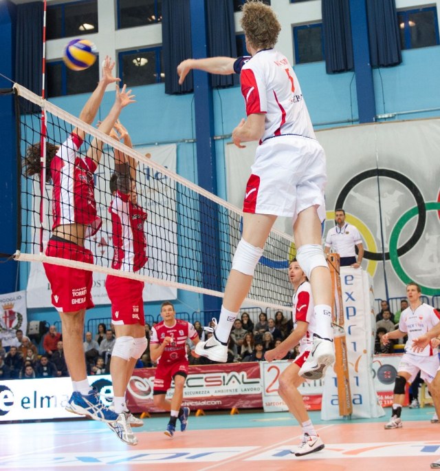 Tutti A Milano! E’ il grido del Pala-Ioan al termine della splendida rimonta biancorossa che porta la Gherardi Svi Città di Castello a giocarsi la Del Monte coppa Italia di serie A2 maschile, domenica prossima alle 14,30 al Forum di Assago contro Atripalda. Dopo i primi due set nei quali gli ospiti hanno sparato tutte le cartucce, soprattutto al servizio, la classe dei tifernati è venuta fuori e il trio Van Walle (30 punti), Fromm e Rosalba ha ribaltato le sorti della contesa. Importante anche l’apporto di Visentin (8 punti, 5 a muro) e dei centrali che hanno toccato molti palloni a muro. La Exprivia Molfetta parte con Del Vecchio in campo al posto dell’acciaccato Verhanneman, gli umbri schierano tutti i titolari. Si parte con la battuta di Molfetta e col punto di Rosalba in diagonale stretta. Subito break in ricostruzione con Van Walle dopo il tuffo di Visentin (2-0). Molfetta recupera con l’ace di Saitta (3-3) che, come da copione, cerca di mettere in difficoltà la ricezione tifernate (3-4). La parallela di Fromm è vincente (5-4), muro di Van Dijk per il 5-6, risposta di Visentin (6-6). E’ una battaglia! Van Walle sigla il 7-6, Van Dijk fallisce la palla dell’8-6 (primo time out tecnico). Giglioli pareggia dal servizio (8-8) e si ritorna al punto a punto. Lo slash di Fromm sorpassa di nuovo i pugliesi (13-12) che tornano avanti sul 13-15 con l’opposto olandese. E’ 13-16 al secondo time out tecnico con la Gherardi Svi che cerca di sciogliersi di fronte all’assalto ospite, fatto soprattutto di battuta tattica. L’Exprivia tiene il vantaggio sempre con Van Dijk (15-18), Rosalba scuote i suoi col muro (17-19). I pugliesi rimangono avanti (18-21), Piano riavvicina col muro (20-21), Ippolito però non sbaglia (20-22). Sul 21-23 Andrea Radici ferma il gioco ma Del Vecchio firma le due palle set (22-24) con una parallela vincente e altro time out Radici. Chiude Del Vecchio. Nel secondo parziale si parte con un piccolo black out elettrico che, tuttavia, non impedisce di cominciare visto che le luci spente sono solo quelle della tribuna. Subito 1-2 con Del Vecchio, Piano pareggia i conti, la palla in rete di Del Vecchio è il 3-2. Braga mura Giglioli (4-2), Van Walle coglie impreparato Rizzo in difesa ed è 5-2. Ippolito mette a segno due battute insidiose e riporta la parità (5-5). Van Dijk non trova le mani del muro (8-6 e primo time out tecnico) ma sigla l’ace dell’8-8. Città di Castello rimane a contatto fino al 10-10, poi va sotto (10-12). Come già successo prima i meridionali vanno avanti grazie al turno in battuta di Ippolito (12-16). Andrea Radici avvicenda Braga con Franceschini e Fromm con Massari ma gli ospiti non si scompongono. Rosalba tiene a galla le speranze (15-19), Van Dijk è implacabile (16-21). Due punti di Van Walle riavvicinano la Gherardi Svi (18-21) ed anche Visentin si fa sentire a muro (20-22). Palla out di Ippolito e time out Exprivia (21-22). Al rientro punto di Van Dijk e time out di Radici (21-23). Van Dijk schiaccia il 22-24 e altro time out biancorosso ma Molfetta rincara la dose. Il terzo set prende l’avvio con qualche protesta dei ragazzi biancorossi per un paio di brutti tocchi in palleggio non sanzionati dal direttore di gara (0-2). Fromm manda avanti i beniamini di casa (4-3), Van Dijk spara fuori e poi commette fallo di seconda linea (6-3) e time-out ospite. Al rientro in campo Ippolito tira la palla in rete (7-3), poi Saitta sigla l’ace del 7-5. La battuta ospite si fa sentire ancora con Giglioli (9-8), Ippolito poi regala un punto (13-10) ma Molfetta non molla (15-13). Al secondo time-out tecnico i padroni di casa conducono di tre punti (16-13), diventano quattro con l’errore di Del Vecchio che costringe Cichello al secondo time out discrezionale (18-14). Doppio cambio pugliesi con Aprea e Morelli per Van Dijk e Saitta e Molfetta va sul 19-17. Rosalba riallontana gli ospiti (20-17) e Van Walle spara l’ace del 21-17. Sul 22-19 si chiude il doppio cambio ospite, Visentin di prima intenzione mette a terra il 23-19. L’Exprivia approfitta di un errore per restare a contatto coi tifernati (23-21 e time out Radici), Rosalba porta a casa tre palle set con la pipe (24-21). Giglioli mette fuori la battuta, tra le proteste molfettesi, e le distanze sono ridotte. Quarto periodo che si apre con due ace di Van Walle (2-0) e col muri di Visentin su Ippolito (3-0). Saitta recupera subito (3-2), Rosalba fa 4-2. Gli ospiti non si scrollano, sono sempre lì (7-7). Break dei padroni di casa (10-8) con l’errore di Van Dijk, Visentin di prima intenzione fa 12-9. Fromm e Braga murano Ippolito che lascia il posto a Morelli (14-10). Alla seconda sosta tecnica la squadra di Radici va sul 16-11 col muro di Van Walle su Del Vecchio. Coach Cichello ferma il gioco sul 19-14 (punto di Rosalba ), al rientro in campo l’ace di Van Walle punisce Rizzo (20-14). Altro time-out meridionale (21-15) e fallo di Morelli in ricezione (22-15). Muro di Fromm sulla schiacciata di seconda intenzione di Saitta (23-15). Il finale di set è tutto del tedesco Fromm che prima spacca in due il muro pugliese poi inchioda Morelli rimandando il verdetto al tie-break. Il primo vantaggio del quinto set è ospite (1-2), Piano sorpassa col primo tempo dietro (3-2). Gli ospiti tornano avanti con Van Dijk (3-4) e Giglioli ma il merito è tutto della battuta dell’olandese che poi è murato da Fromm (5-5). Errore tifernate in attacco (5-7), ancora pareggio a muro con Van Walle su Ippolito (7-7). Al cambio di campo i locali conducono (8-7). Entra Massari e spara l’ace dell’11-9. Van Walle tira un ottimo mani out (12-10) poi però sbaglia la battuta. Muro di Visentin su del Vecchio (13-11), palla out di Del Vecchio e altro time out ospite (14-11). La contesa la chiude Van Walle che scatena il putiferio al Pala-Ioan, il sogno continua. Il presidente Arveno Ioan indossa la maglia della final-four di Venezia-Mestre del 1991 mentre la Curva Nord, impareggiabile per il suo ap