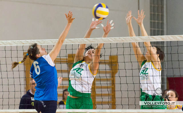 la perugina Arianna Cecchetti in attacco e le orvietane erica Fiorini e Francesca Rosa a muro