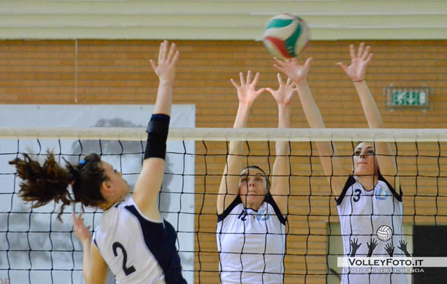 attacco della perugina Caterina Gradassi e muro delle ternane Irene Tocca ed Alessandra Favoriti