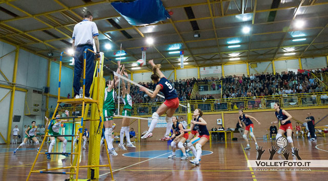 Nella prima sfida della finale play-off femminile ci vogliono cinque set per trovare una vincitrice. A fare il colpaccio è una Zambelli Orvieto a cui non manca il carattere per effettuare una rimonta difficile con due set di ritardo. Ciò che manca invece alla New Font Prep Mori Gubbio è solo un pizzico di fortuna. Le padrone di casa si mostrano toniche ed in grado di contrastare la potenza di fuoco avversaria tenendo il pallino in mano. La battaglia è apertissima sino al 6-9 del secondo set, momento nel quale la dea bendata decide di dare un piccolo aiuto alle ospiti mettendo fuori causa Pascolini (sino a qual momento molto positiva). Cambia inesorabilmente l’inerzia del match, pur portando in maniera rocambolesca il punteggio sul due a zero, il gioco delle locali è più scontato. Ne approfittano le ospiti che risalgono dalla polvere e vanno a trionfare. In una Polivalente gremita in ogni ordine di posto l’euforia sale altissima già trenta minuti prima del fischio. La temperatura diventa incandescente all’arrivo dei due pullman di tifosi ospiti che fanno crescere la confusione, interrotta unicamente dal minuto di silenzio in memoria di Roberto Burnelli, poi è solo rumore bianco per oltre due ore. Meno incisive ma anche meno fallose le padrone di casa a cui basta qualche spunto delle centrali per rimanere attaccate (7-7). Sul turno di battuta di Riso, che piazza due ace, cominciano i problemi in ricezione altrui e Gubbio va a +4 ma la reazione delle donne della Rupe arriva col doppio muro di Rosa (13-12). Il secondo strappo prodotto da Ragnacci (otto palle vincenti in apertura) viene neutralizzato da Fiorini che da fondo campo sigla il 17-17. L’allungo decisivo è opera ancora della battuta locale, Nicchi si procura quattro set-point e le rossoblu vanno in vantaggio. La Zambelli riprende a giocare con Toppetti al posto di Sangiorgi ma è Verdacchi a mandarla avanti (4-8). La battaglia è accesa e sul 6-9, in una ricaduta da una fast vincente, cede il ginocchio destro di Pascolini. Sono attimi scioccanti per tutti gli spettatori che trattengono il respiro mentre la giocatrice numero 1 si tocca la gamba e si dispera a terra (nell’agitazione del momento va sottolineato il pronto intervento di Fiorini, avversaria che evidenzia grande sportività prestando le prime cure nella sua veste professionale di fisioterapista). Al suo posto entra Cicci. Perdita grave per le eugubine che però non si scompongono e sul turno di battuta di quest’ultima sorpassano (14-12). Cerbella sale in cattedra e con cinque punti consecutivi (due attacchi e tre muri) scrive il 19-15. La reazione orvietana é affidata ad una Fiorini inarrestabile (otto palle a terra) ma sul 24-21 la rimonta sembra impossibile. Annullate le prime tre occasioni ce n’é una quarta che chiuderebbe i conti ma l’attacco di Cerbella viene giudicato out facendo montare le proteste tra i tifosi sugli spalti. Arriva la quinta opportunità ed è un errore orvietano a consegnare il raddoppio. Nel terzo set Orvieto prende subito il comando sfruttando la rabbia di Verdacchi (8-11). La squadra rossoblu cambia strategia e si affida a Merluzzi che impatta due volte, sul 12-12 e sul 14-14. Nel momento topico protagonista assoluta é la seconda linea con le biancoverdi più attente e con Campana in grado di mandare a segno le compagne guadagnando tre lunghezze che poi, in un batter di ciglia, Ragnacci neutralizza (19-19). Qui finisce la benzina alle locali che subiscono la potenza di Fiorini, autrice di altri otto punti, incluso quello che riduce le distanze. Il quarto frangente registra un calo di ritmo, si lotta punto a punto sino al 12-12. Si fa vedere Ragaini che con un guizzo scava il solco portando la situazione sul 12-18. Manca la forza alle eugubine che subiscono passivamente gli affondi della furia Fiorini ed il verdetto è rimandato. Il tie-break é incandescente, un cartellino giallo all’indirizzo della eugubina Ragnacci scalda ulteriormente gli animi in tribuna (5-6). L’inerzia viene rotta dopo il cambio di campo con le ospiti che scappano (7-10). Gubbio rientra in scia ma poi sciupa e sull’11-14 l’attesa si prolunga per l’espulsione della orvietana Rosa. Alla ripresa il sigillo arriva da Sangiorgi che fa calare il sipario. Uno a zero per la Zambelli nella serie e gara-due che sposta le attenzioni sabato prossimo al Pala-Papini.