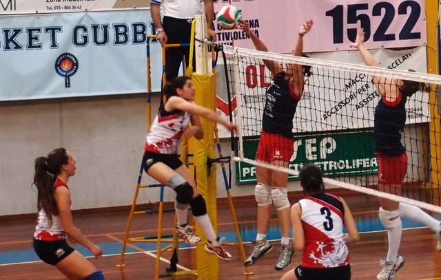 la perugina Ayelen Burnelli in attacco e le eugubine Tania Ragnacci e Federica Cerbella a muro