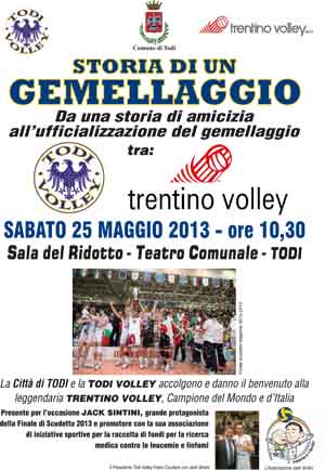I gemellaggi sono motore di turismo e di sport e Todi ha sempre sostenuto in questi anni iniziative che hanno permesso di valorizzare l’offerta turistico-sportiva del territorio coniugando l’organizzazione di iniziative sportive agli scambi culturali tradizionalmente praticati attraverso i gemellaggi. Nel più ampio quadro dei gemellaggi sportivi la Todi Volley inserisce l’ufficializzazione del gemellaggio di sabato 25 maggio alle ore 10,30 alla Sala del Ridotto del teatro comunale tra la pluridecorata Trentino Volley, fresca vincitrice dello scudetto e prima ancora trionfante in coppa Italia e mondiale per club e champions league e la società sportiva tuderte. Attualmente impegnata nei play-off promozione con la sua prima squadra femminile, Todi dichiara ambiziosi progetti di crescita verticale in tempi brevissimi, già dalla prossima stagione, sotto la nuova spinta propulsiva del suo nuovo presidente Fabio Cauduro, imprenditore del nord stanziatosi in Umbria che opera nel segmento management, marketing internazionale, eventi e comunicazione. Per il sodalizio trentino sarà presente, amministratrice delegata del settore giovanile Iris Wintzek ed il palleggiatore Giacomo Sintini, romagnolo di nascita ma da anni radicato in Umbria e grande protagonista della finale tricolore di domenica 12 maggio. Per la Todi Volley sarà il presidente Cauduro a fare gli onori di casa, affiancato dall’attuale capitano della squadra femminile, l’opposto Katia Irlando. Un gemellaggio nato dal cuore sportivo di due realtà apparentemente così distanti ma accomunate da un inizio simile. Anche a Trento, come a Todi, tutto è nato dal nulla, dalla tenacia e caparbia di un grande imprenditore, il cavalier Diego Mosna, supportato e coadiuvato da uno staff appassionato. In pochi anni Trento ha realizzato un sogno che è già leggenda, e ora guarda con affetto il coraggio e l’intraprendenza di una piccola realtà come quella di Todi, che pensa in grande e guarda lontano. Piccole strane coincidenze hanno fatto incontrare questi due mondi ed è subito nata l’intesa e la voglia di fare qualcosa insieme per lo sport, per i nostri giovani, per il territorio. Sintini tra l’altro in questo fine settimana organizza una tappa nazionale di minivolley organizzata dalla sua omonima associazione, per la raccolta di fondi per la ricerca medica contro le leucemie e linfomi. Il mondo della pallavolo al fianco della ricerca. Il tutto avverrà nell’ambito istituzionale offerto dalla nuova amministrazione comunale di Todi che ha accolto l’iniziativa con entusiasmo. Dall’assessorato allo sport un plauso alla società sportiva per lo straordinario lavoro svolto e per la progettualità in cantiere. Dal comune di Todi anche l’impegno a sostenere iniziative analoghe tese a favorire lo sviluppo dello sport come fenomeno sociale di integrazione, di solidarietà e non ultimo di promozione turistica.