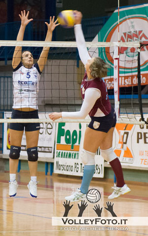 Alla ricerca di un’agognata salvezza, fino all’ultima schiacciata, la Ecomet Marsciano si congeda dal suo pubblico al Pala-Pippi, affrontando l’ormai retrocessa Ekofarma Montecchio. Il team guidato dal duo Sanna – Castellano, si presenta al suo pubblico determinato, Carboni colpisce prima sulla banda poi in battuta ed è 4-2, a proseguire fino al netto vantaggio 8-3 contribuisce l’ottima difesa di Cavalagli e Piccari, e sul muro di quest’ultima, che vale il 13-6, il tecnico marchigiano, ricorre ad una sosta discrezionale. Ma contro una squadra così compatta, poco si può, Carboni fissa il 16-7, mentre capitan Tiberi continua ad incrementare fino al 20-10. La reazione a muro di Mancino prima, e di Cecchini poi, sono poca cosa, Caputo fa 24-14, e dopo un errore in battuta, è il muro di Tiberi a chiudere. Ripartono con Carboni, in poppa, le padrone di casa e sul 6-1, interviene ancora il tecnico ospite, Righi sembra raccogliere le giuste indicazioni, ma il muro di Caputo, vale l’8-3 e quando poi Piccari mette a terra l’attacco del 13-4, coach Costanzi, sfrutta la seconda sospensione facoltativa. Cecchini prova a smuovere il tabellone, ma le umbre non mollano, capitan Tiberi attenta a muro e Santi, con la sua fast, volano verso il doppio vantaggio, concretizzato da Carboni. Ancora le marscianesi in vantaggio nel terzo set, il muro di Santi vale il 4-0, poi però il meccanismo muro difesa, fino ad ora perfetto, si scollega e Righi è pronta ad approfittare, e l’ace di Cecchini fa 4-4. Comincia poi uno stillicidio, al sorpasso marscianese si controbilanciano le ospiti, l’8-7 di Caputo, è episodica Battistelli risponde sul 10-10, Carboni riparte ma, per la prima volta, le ospiti si portano in vantaggio, con Pappacena che manda le squadre alla seconda sosta tecnica sul 13-16. Il richiamo del tecnico marscianese, trova la reazione delle beniamine locali, che punto su punto si riavvicinano, la resistenza di Gregorini è definitivamente placata dal 20-20 di Carboni, poi, salita in battuta Piccari, la ricezione ospite vacilla, mentre Crisanti oltre che colpire di prima intenzione, smarca i suoi attaccanti, fornendo a Tiberi la palla che vale l’intera posta. Fatto il proprio dovere, da parte del team della Ecomet, l’interesse della tifoseria si concentra, sul campo di Jesi, dal quale dipende l’obiettivo finale, delle marscianesi. In tarda serata arriva l’amara sorpresa, solo per differenza set la Ecomet è al quartultimo posto e dunque retrocessa.