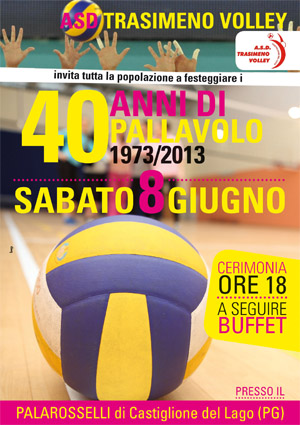 Sabato di festa per la Trasimeno Volley Castiglione del Lago che ha dato appuntamento il giorno 8 giugno al palasport Rosselli, centro nevralgico dell’attività sportiva biancorossa, a tutti i suoi tesserati e agli amici per celebrare un momento storico. La società lacustre infatti ha compiuto 40 anni ed ha voluto condividere questo importante momento con tutti coloro che sono stati e sono attualmente vicini. Dalle ore 18 in poi un fiume di persone convergeranno nell’impianto sportivo castiglionese per assistere ad una breve cerimonia che precederà la serata conviviale. Ci saranno gli stand di Avis ed Aido, partner etici con cui si è consolidato nel tempo il rapporto, e tante leccornie da mangiare (porchetta, dolci e nutella party per i bambini). Un incontro semplice ed aperta a tutti in cui non mancheranno le sorprese. Una società nata del 1973 e che con la sezione maschile conobbe il suo massimo splendore nella stagione 1982-1983 con l’allora Put Jeans che arrivò a calcare il parquet della serie A2 maschile lanciando personaggi di rilievo nazionale come Damiano Pippi.
