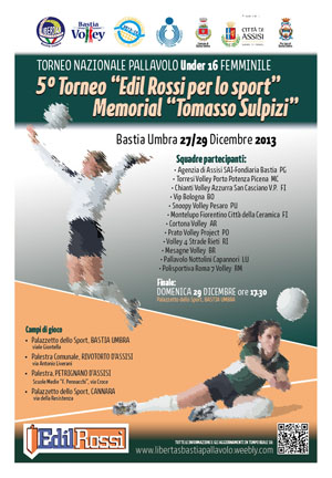 È tutto pronto per la quinta edizione del torneo nazionale ‘Edil Rossi per lo sport – Memorial Tomasso Sulpizi’ che vedrà arrivare a Bastia Umbra dal 27 al 29 dicembre 2013 dodici formazioni under 16 femminili provenienti da tutta Italia. Le squadre sono state divise in quattro gironi da tre che si disputano con formula all’italiana. Nel girone A sono inserite: Agenzia di Assisi Sai-Fondiaria Bastia, Torresi Porto Potenza Picena e Chianti San Casciano. Nel girone B: Vip Bologna, Snoopy Volley Pesaro e Montelupo Fiorentino Città della Ceramica. Nel girone C: Cortona Volley, Prato Volley Project e Volley 4 Strade Rieti. Nel girone D: Mesagne Volley, Pallavolo Nottolini Capannori e Polisportiva Roma 7. Le prime due classificate di ogni girone accedono ai quarti di finale. Le terze classificate disputano le semifinali per i piazzamenti dal nono al dodicesimo. Sono previste semifinali e finali per tutti i piazzamenti. Si giocherà nei giorni di sabato 28 e domenica 29 dicembre 2013 in quattro impianti sportivi. Il palazzetto dello sport di Bastia Umbra, la palestra comunale di Rivotorto di Assisi, la palestra delle scuole medie Pennacchi di Petrignano di Assisi ed il palazzetto dello sport di Cannara. Il torneo vede il coinvolgimento di molti volontari della storica società Libertas Pallavolo Bastia con la collaborazione del Bastia Volley, senza i quali il torneo non si sarebbe potuto organizzare e ai quali va in anticipo un caloroso ringraziamento. Grazie anche a tutti gli sponsor che continuano a credere in questa manifestazione rivolta alle giovani. Il torneo è patrocinato dai comuni di Bastia Umbra e di Assisi, dalla Federazione Italiana Pallavolo nazionale e dai comitati regionale e provinciale. L’arrivo per le comitive è previsto venerdì 27 dicembre quando come ogni anno, la Pro Loco di Bastia Umbra offrirà un buffet di benvenuto. Le squadre alloggeranno all’Hotel Cristallo, all’Hotel Panda e all’Albergo Valle Verde. Qui la brochure della manifestazione.