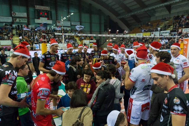 Pre-partita di serie A1 maschile mai così intenso e ricco di significato ieri al Pala-Evangelisti. Prima dell’inizio del match valido per la decima giornata di regular season, Perugia e Trento si sono infatti trovate a centrocampo per dar vita ad un momento particolarmente bello e sentito, nel segno dell’Associazione Giacomo Sintini. Il regista dei trentino ha infatti sfruttato l’opportunità di poter chiudere lo splendido 2013 proprio nella sua Perugia per consegnare i regali che ogni anno, attraverso la onlus benefica che porta il suo nome, dona ai bambini del reparto di Oncoematologia Pediatrica ed Ematologia dell’ospedale Santa Maria della Misericordia di Perugia, lo stesso dove Jack è stato curato ed ha vinto la partita più importante della sua vita. A ricevere i pacchi direttamente dalle sue mani ma anche di quelle dei suoi compagni di squadra e dei giocatori umbri c’erano una ventina di piccoli pazienti, che hanno così potuto gioire per i giocattoli ricevuti ma anche passare un pomeriggio differente dal solito a stretto contatto con il mondo dello sport. «Questo è il secondo Natale consecutivo che con la mia associazione portiamo avanti questa iniziativa per i bambini del reparto dell’ospedale umbro – ha spiegato Giacomo Sintini – un mese prima di questo periodo raccogliamo le loro richieste e poi, grazie alle donazioni che riceviamo, cerchiamo di esaudire i loro desideri. Lo scorso anno eravamo andati fra le corsie a consegnarli, in questa caso, sfruttando l’opportunità offerta da questa partita, ci è sembrato più bello poter portare i bambini direttamente al Pala-Evangelisti, per regalare loro anche una bella partita di pallavolo. Purtroppo non tutti i pazienti possono lasciare l’ospedale, viste le loro condizioni: è per questo motivo che domattina tornerò al Santa Maria della Misericordia di Perugia per completare l’iniziativa e concludere la consegna dei pacchi. Vedere il loro sorriso quando ricevono quello che avevano richiesto a Babbo Natale è davvero una sensazione fortissima; ringrazio quindi tutti coloro che mi permettono di portare avanti questo progetto con la mia Associazione attraverso le offerte che mese dopo mese crescono sempre di più e ci permetteranno di realizzare non solo questa iniziativa ma anche tante altre in favore della ricerca. Grazie a tutti e buon Natale». Da un anno e mezzo l’Associazione Giacomo Sintini è impegnata nella raccolta di fondi per la ricerca medica contro Leucemie e Linfomi e per l’assistenza in campo onco-ematologico. Per maggiori informazioni consultate la pagina ufficiale facebook o l’account twitter.