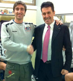Si è ritrovata ieri al Pala-Evangelisti la Sir Safety Perugia. Dopo il lunedì di riposo susseguente alla vittoria di Ravenna, i ragazzi di Kovac si sono presentati nell’impianto di Pian di Massiano ovviamente con il morale alto e con la serenità derivante dal quarto posto in classifica e dai tre successi consecutivi in campionato. Al tempo stesso però Vujevic e compagni sono apparsi subito molto determinati e concentrati in vista del prossimo turno di campionato che vedrà i block-devils affrontare Latina domenica pomeriggio in casa. Kovac ed il suo staff hanno analizzato con meticolosità la gara di Ravenna, puntando l’attenzione sugli aspetti positivi ed anche sulle situazioni di gioco e tecniche che hanno al contrario palesato qualche difficoltà per capire come migliorare. I bianconeri svolgeranno il consueto programma settimanale di lavoro, alternando sedute tecniche, fisiche e tattiche con lo studio del prossimo rivale di Perugia. Ieri pomeriggio intanto consueto piacevole intermezzo dopo ogni vittoria con la premiazione nello spogliatoio bianconero del Man of the Match di Ravenna. Un sorridente presidente Sirci ha consegnato il premio dell’occasione, dei bellissimi pantaloni della linea Sir Safety System naturalmente griffati block-devils, ad Adriano Paolucci. Il regista nativo di Roma si è aggiudicato il riconoscimento grazie ad un ingresso fondamentale nella quarta frazione di gioco. Ingresso che ha dato stabilità e sicurezza al gioco offensivo di Perugia e che ha fruttato due importantissimi punti nelle fasi finali del set tra cui l’ultimo, realizzato direttamente dalla linea dei nove metri, che ha chiuso il confronto. ‘Monster’, elemento importante del gruppo di Kovac, professionista esemplare e giocatore sempre pronto a mettere la sua esperienza al servizio della squadra quando chiamato in causa, si è poi sottoposto alle consuete foto di rito con il presidente Sirci, tra gli applausi di tutto lo spogliatoio. Viatico ottimo prima di cominciare a sudare in palestra. Latina si avvicina ed i bianconeri vogliono presentarsi al top!
