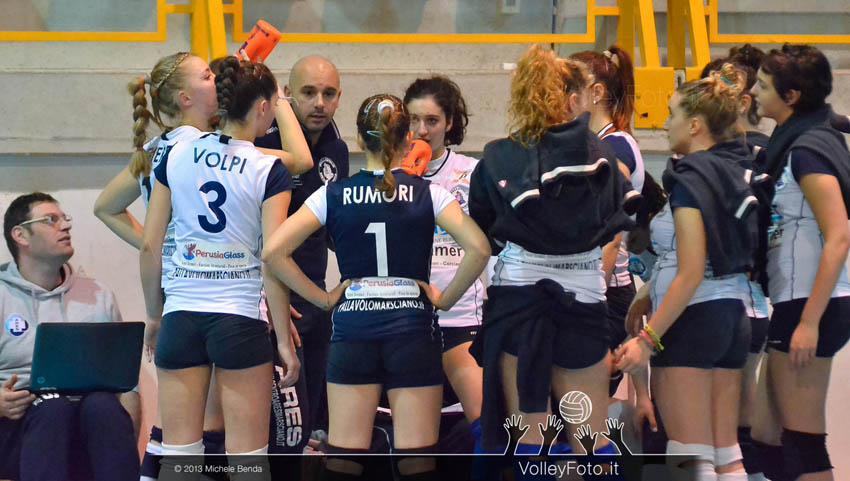 Con un team, sempre più giovane, la Ecomet Marsciano scende sul parquet della Di Lucca Nottolini Capannori, che occupa la terza posizione in classifica. C’è la voglia di dare il massimo e di far vedere i progressi fatti, anche se non confortati dalla scalata in classifica. Un inizio equilibrato pone in evidenza le centrali, Bianciardi per le locali e Pucciarini per le ospiti, poi ancora gomito a gomito dopo gli attacchi di Dovichi da una parte, e Santi dall’altra (6-6). Due ace di Renieri mandano alla sosta tecnica e poco dopo, con le biancoblu stoppate sull’11-8 da Maltagliati, coach Piazzese interviene discrezionalmente, ma la sua squadra avanza solo grazie agli errori locali che, comunque, restano salde al comando con De Cicco e Marsili, quest’ultima appena entrata, mette in difficoltà la difesa avversaria, costringendo al secondo intervento del tecnico ospite sul 20-10. Grandi ha solo il tempo di rimandare la conclusione che arriva subito dopo con un errore in battuta delle ospiti. Il secondo set riprende ancora in equilibrio (7-7), interpreti Renieri per le toscane, e Santi e Cerquetelli per le ospiti. Volpi riesce a scandire la prima sosta tecnica. Tempo sufficiente per le padrone di casa di ritrovare la concentrazione e riprendere le redini della gara. Renieri e Maltagliati, mettono a meno sei le ospiti che, pur plaudendo alle belle difese di Rumori, non incamerano punti, precisi e decisivi gli attacchi di Marsili che conquista il doppio vantaggio. A dimostrare il buon lavoro di Piazzese ci pensano le giovani marscianesi in avvio di terzo set, quando con Larini e Grandi, ancora una volta, riescono a rimanere incollate alle padrone di casa fino al 6-6. Marsili prova lo strappo ma capitan Volpi ricuce (8-8). A far allontanare di nuovo le locali, ci pensano gli errori marscianesi, e ad incrementare ci pensano le bocche di fuoco avversarie, ben gestite dalla regista Davini. Sartelli e Bianciardi non lasciano respiro alle umbre e sul pallonetto di Marsili arrivano i tre punti in palio al meritevole Capannori.