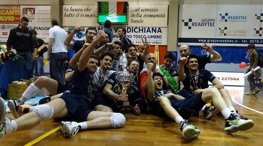 Il sorriso di capitan Grassano quando alza la coppa in è un’immagine che difficilmente potrà essere cancellato dalla mente degli oltre mille tifosi della Emma Villas Chiusi presenti al Pala-Coopersport. La squadra del presidente Bisogno conquista la coppa Italia di serie B2 maschile battendo la Nature Energie Lagonegro tra le sue mura, iscrive il suo nome sul prestigioso trofeo alla sua prima partecipazione. Giocano contratti i toscani per due set, nella terza frazione sono sempre a stretto contatto di gomito coi rivali, l’eccessiva sicurezza gioca un brutto scherzo ai lucani. Qualsiasi squadra avrebbe potuto pagare a caro prezzo le incertezze di questo inizio disastroso, ma non Chiusi che trova la forza e le risorse per ribaltare la situazione. In avvio c’è equilibrio con i lucani che non si lasciano intimorire dalla marea di pubblico che incita il sestetto locale, il regista Parisi smista con grande precisione e manda a segno i suoi procurandosi il 4-6. I padroni di casa vengono fermati più volte a muro, ne subiranno tre e non lasceranno nemmeno un segno in questo set, ma non demordono e Bittoni accelera al primo time-out (8-7). La lotta è serrata e nello spalla a spalla si distingue Toma che guadagna un break; Scappaticcio cerca spesso Romani che fatica a mettere giù palla (14%), mentre Durante (otto palle a terra in apertura) gioca bene sulle mani del muro e propizia lo strappo (15-19). A questo punto i leoni vengono punti nell’orgoglio e reagiscono violentemente con un Pochini che è un gatto in seconda linea e Braga che è un avvoltoio a rete e sfrutta le occasioni per il sorpasso (21-20). Lagonegro riparte e va a chiudere con tre punti consecutivi. Alla ripresa è la grinta di Bittoni a dare la scossa e Braga lo segue ma i quattro punti di vantaggio vengono sciupati e in un attimo il capitale è sperperato (11-11). A mettersi in luce stavolta è Vacchiano (85% in ricezione) che in difesa fa miracoli e Durante provoca lo strappo mettendo a nudo la crisi, più mentale che tecnica, dei chiusini (13-18). Bartolucci rileva Pasquini e poco dopo Giannini cambia la diagonale di posto-due facendo entrare Bregliozzi ed Urbani ma la situazione è pesantissima (14-21). Gli ospiti si possono permettere il lusso di un rilassamento ma il turno in battuta di Braga opera la rimonta che aggancia sul 24-24. Altri tre set-point sono annullati ma il quarto è fatale per un errore, il decimo nel parziale, di Bittoni che schiaccia a rete. Nella terza frazione c’è Bartolucci in campo e il punteggio rimane in asse sino all’8-8. La situazione si sblocca con Braga dai nove metri che manda sul +4 e i due muri consecutivi dei lucani non intaccano le ritrovate sicurezze dei biancoblu che restano avanti (15-11). Pasquini rileva Bittoni ma l’attacco è sempre in sofferenza (altri sette i muri subiti) e alla prima occasione Cubito fa sentire il fiato sul collo (17-16). Ancora la battuta toglie le castagne dal fuoco, stavolta con Romani (undici colpi vincenti) che piazza l’ace del +3 e poi con Pasquini che favorisce il 22-18. A ravvivare il finale è Saccone che col muro ricuce lo strappo (23-22). La Emma Villas però tiene i nervi saldi e riapre il match con un primo tempo di Braga che scatena l’urlo liberatorio del palazzo. Il quarto periodo comincia con la diagonale di banda Pasquini-Bartolucci mentre Lagonegro non cambia una virgola. Si avanza punto a punto ma al primo time-out tecnico Romani piazza il break (9-7). Romani resta incisivo e Pasquini regge bene il ritmo ma basta perdere lucidità per un momento che Toma riporta al comando la Natura Energie (14-15). Dura un attimo però perché lo sforzo prodotto viene pagato con tre errori pesanti a cui Romani fa la ‘giunta’ con tre bombe consecutive che creano la spaccatura (22-17). Sono praticamente tutti dell’opposto chiusino, che mette a referto altri tredici punti, i punti che spingono sul due pari, due suoi ace e rimandano il verdetto. Al tie-break parte meglio Lagonegro che cerca di sganciarsi due volte ma viene ripresa in entrambe le occasioni. Sul 5-5 le proteste di coach Bosco provocano un cartellino rosso e successivamente la difesa di Pochini permette l’allungo che infiamma la platea e porta al cambio di campo con tre lunghezze di margine. I punti consecutivi del Chiusi diventano sei ed è un monologo biancoblu (9-5). Scappaticcio sfrutta un Romani incontenibile che amplia la forbice mostrando tutto il suo repertorio (11-6). L’inerzia è impossibile da cambiare e sul 14-8 ci sono sei coppa-point, gli spettatori li vivono tutti in piedi fino ad esplodere la loro gioia sul definitivo attacco di Braga che pone fine alla disputa. Partono le note di ‘we are the champion’ e l’invasione di campo è una festa per la cittadina toscana che sfata un tabù vincendo in casa una competizione stregata per chi la ospita. La ciliegina nella torta è il premio di miglior giocatore del torneo assegnata a Nicola Romani autore di uno score da record con quarantuno palle a terra. Una menzione speciale la meritano però anche il palleggiatore ternano Leonardo Parisi che ha dimostrato di avere sempre classe cristallina ed il libero perugino Filippo Pochini che ha rasentato la perfezione in seconda linea chiudendo con un superlativo 85% di efficienza.