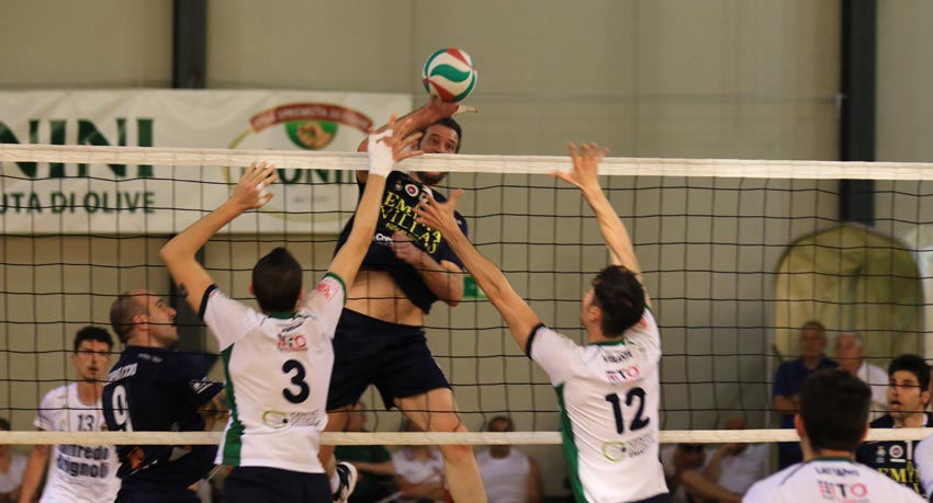 Al termine di una prestazione da guinness dei primati la Emma Villas Chiusi passa al Pala-Rota e pareggia i conti nella serie della finale play-off di serie B2 maschile. Ci vorrà lo spareggio per sapere chi sarà ad essere promossa e la Monini Spoleto mercoledì dovrà tornare in trasferta per l’ennismo confronto che si annuncia infuocato. I toscani, messi alle corde nella prima partita, riescono a togliersi dall’angolo andando in vantaggio ma poi subiscono la rimonta degli umbri e per imporsi nel secondo atto devono ricorrere al tie-break. Una cornice di pubblico fantastica con circa mille spettatori (circa trecento ospiti) che hanno fornito un colpo d’occhio eccezionale in un match senza ombra dubbio di categoria superiore e con la pregevole iniziativa del club locale che ha distribuito a tutti gli intervenuti dei gelati omaggio. Al fischio d’inizio le squadre in campo sono quelle annunciate, nessuna variazione sul tema con i due tecnici che danno fiducia al consueto modulo e ai soliti titolari. Si gioca in una bolgia infernale, pubblico delle grandi occasioni e temperature africane, è una finale e c’è pure l’eccitazione a complicare le cose in un duello che si protrarrà per tre ore. Si parte con Scappaticcio che cerca insistentemente gli schemi di primo tempo ma i padroni di casa trovano il break grazie alla battuta incisiva, due gli ace, e volano sul 10-7. La reazione è progressiva ed il gap viene annullato da un muro di Braga che aggancia (14-14). Spoleto riparte ma gli ospiti finalizzano con Bittoni e Romani (cinque palle a terra in apertura) e riescono a mettere per un attimo il naso avanti. Sul 19-19 Giannini getta nella mischia Santilli e Bregliozzi, ma i cambi non sortiscono effetti. Stessa cosa per Costanzi che rileva a muro Torre. È invece Pasquini a piazzare l’allungo con due mani e fuori e Scappaticcio mura Lattanzi procurandosi tre palle-set, l’errore di Vigilante in attacco vale il vantaggio. Si riprende a giocare con stessa intensità e con gli oleari che prendono il comando delle operazioni sfruttando Ceccarelli, le due lunghezze sono riprese per merito di uno straripante Bittoni che rimette in asse (7-7). Si avanza a braccetto con Torre che trova in Vigilante un punto di riferimento e lo sfrutta a dovere ma il break è ancora recuperato dai leoni col muro, prima Romani e poi Di Marco, che trova le misure (15-18). La ricezione locale salta sul turno di battuta di Romani (altri otto sigilli per lui in questo set) che con due ace scrive il 16-22. La girandola di sostituzioni biancoverde è solo un palliativo per attendere il raddoppio che arriva di nuovo su errore di Vigilante che sbaglia misura. Nella terza frazione la partenza degli uomini di coach Giannini è migliore e la Monini sembra arrancare, almeno sino al 5-8. Basta un guizzo di Vigilante che, se non sbaglia, continua ad essere incontenibile in attacco, a riportare equilibrio (10-10). Dalla parte opposta anche Romani ha la spalla calda ed infligge punizioni a ripetizione, Chiusi prova il secondo strappo ma l’ingresso di Musco da nuova linfa alla Monini che rimette in asse (15-15). Il punteggio non si sblocca, si avanza punto a punto e si profila un arrivo allo sprint, sul finale è proprio Musco a sfruttare una ricezione slash che assicura due set-point ma Romani infila la doppietta e li annulla (24-24). A risolvere ai vantaggi è un diagonale di Vigilante che accorcia le distanze. Il quarto periodo non fa differenza dai precedenti con botta e risposta, il muro ospite porta avanti e l’attacco di Vigilante rimette in asse (11-11). S’ingaggia uno spalla a spalla prolungato, la difesa di Pochini salva qualche pallone importante ma le formazioni rimangono incollate (18-18). Il break arriva con Bittoni che porta avanti di due ma poi Spoleto, con Torre al servizio, ne infila quattro e rovescia (22-20). Tutto da rifare quando Bittoni trova l’ennesima parità sul 23-23, e si va per un’altra volata. Decisivo stavolta è l’errore in attacco di Romani che rinvia il verdetto. Al tie-break le emozioni non finiscono, ma la stanchezza si fa sentire dopo oltre due ore e mezza di gara e gli atleti commettono qualche errore in più (6-6). Prima del cambio di campo Chiusi riesce a portarsi avanti ma sul 9-11 si vede assegnare un cartellino rosso alla panchina e poi due errori di Romani invertono (13-12). Spoleto ha a disposizione due palle per la promozione ma vengono annullate e l’errore di Vigilante fa scoppiare la festa della Emma Villas.