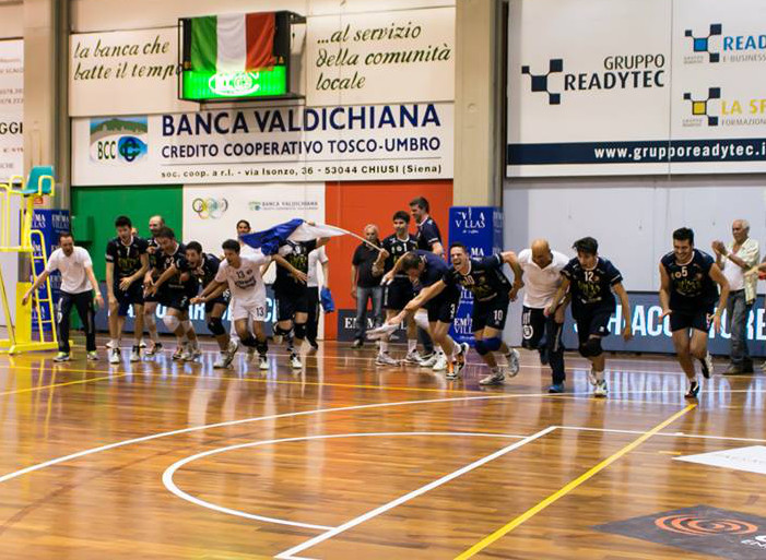 È serie B1, di fronte ad una vero e proprio muro di tifosi la Emma Villas Chiusi corona il proprio sogno. Grande impresa dei ragazzi di Romano Giannini che al primo anno di serie B2 riescono a centrare il loro “duplete”. A dodici mesi dalla promozione dalla serie C, ancora non appagati dalla vittoria in Coppa Italia, i leoni toscani strappano all’ultima giornata la meritatissima promozione in B1. Clima rovente al Pala Fuccelli, esaurito in ogni ordine di posto già a trenta minuti dall’inizio del match. Chiusi scende in campo con il solito starting six (Scappaticcio-Romani, Braga-Di Marco, Pasquini-Bittoni, Pochini libero), dall’altra parte si conferma Spoleto (Torre-Vigilante, Battistelli-Ceccarelli,Segoni-Lattanzi, Marchetti libero). La partenza è la classica delle ultime sfide, sempre punto a punto fino al primo time-out tecnico (6-8); poi ci pensa uno scatenatissimo Romani ad aprire la strada ispirato da un sempre lucido Scappaticcio (16-12); sul 20-17 Giannini si gioca la carta Urbani al servizio al posto di Braga ed il giovane perugino piazza un break importante con una serie micidiale di battute (23-17) per poi chiudere agevolmente 25-19. Il secondo set, con formazioni confermate, evidenzia tutta la voglia matta di promozione dei toscani, mostrando tutte le debolezze di una Monini Spoleto frastornata; subito 3-0 avanti per poi dilagare fino a 10-3 con super-Bittoni in attacco e lo stesso Romani. Intanto Spoleto cerca il bandolo della matassa intervallando una serie di sostituzioni; Ceccarelli cerca di riaprire il set fino al time out (16-8); ormai il trend è quello giusto e con Di Marco a muro e Pasquini e Pochini in difesa si chiude il set sul 25-16. Terzo parziale sulla falsa riga del primo, con Spoleto che resta a galla ad una serie di errori in casa toscana; la Emma Villas gioca bene ma non riesce ad essere cinica (8-7); Scappaticcio inizia ad appoggiarsi ad uno stoico Braga (part-time da ormai venti giorni per problemi ad una spalla) ed il solito Bittoni tengono sempre vivo il set (15-16); entra Urbani per far rifiatare uno stanchissimo Romani ma i chiusini non sembrano sapersi staccare dagli oleari (23-22) per poi concludere agevolmente con l’esplosivo punto del 25 di Braga a muro su uno spento Vigilante. Come sempre detto e sottolineato, il sogno si è avverato, Chiusi per la prima volta nella sua storia, il prossimo anno, parteciperà al campionato di serie B1, obiettivo mai espressamente pronunciato, ma sempre desiderato. La squadra durante la stagione, molto impegnativa e ricca di appuntamenti, è riuscita brillantemente a superare le varie difficoltà riscontrate e la promozione in serie B1 è stata ampiamente sudata e meritata. Il paese tutto ha reso onore ai ragazzi, allo staff, alla dirigenza, al presidente Giammarco Bisogno, ma al contempo un encomio unico va fatto ai tifosi, numerosissimi e rumorosissimi, che hanno reso possibile la realizzazione di questo sogno. È una squadra che esulta, un’azienda, quella della Emma Villas, che gioisce, una città entusiasta, pazza di questo sport, che alla fine della partita festeggia sul campo di gioco e con i clacson per le strade. E’ la Emma Villas Chiusi, che nel giro di pochi anni sta diventando veramente una grande realtà del volley italiano.