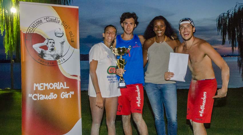 Ad aggiudicarsi il torneo ed il titolo 2014 è stata la squadra dei ‘Pull’ formata da Filippo Agostini, Davide Urbani e Beatrice Meniconi, una terna che si è imposta in una finale mozzafiato al termine di tre combattutissimi set sul collettivo dei ‘Ciccicoco’ composta da Cesare Gradi, Filippo Pochini e Giada Vergoni altri favoritissimi alla vigilia. Il punteggio finale testimonia l’equilibrio dei valori in campo (19-21, 21-19, 15-11), per una partita che si è conclusa praticamente dopo il tramonto e con una luce al limite del regolamento, complicazioni di visibilità che aumentano la bravura dei protagonisti. Terzo gradino del podio per la formazione dei ‘Frulla’ composta da Roberto Menculini, Simone Picchio e Valeria Pippi che nella finale di consolazione hanno superato i rivali denominati ‘3 birre al campo 2’ che contavano su Francesco Iorio, Alessandro Oggiano ed Elisa Barluzzi ed è salita sul podio. Anche in questo caso il risultato del match è lo specchio di quanto sia stata combattuta la partita risoltasi in due set (26-24, 21-15). Impossibile nominare tutti ma certamente una menzione la meritano i ‘Palo’ con Marco Brunetti, Simone Di Arcangelo ed Elisabetta Bertini che, sommando l’età di tutti, è risultata la formazione più navigata con un totale di 135 anni, dimostrando di poter tenere il campo nonostante la perdita d’abitudine alle gare. Previsti anche diversi riconoscimenti speciali che sono stati riservati a livello individuale, la giuria tecnica ha assegnato il premio ‘meglio assortiti’ a Massimo Bifarini che è stato tra i pochi a presentare una squadra con due donne in campo; il premio ‘dottor Gibaud’ per il giocatore più fasciato è andato ad Alessandro Oggiano; il premio ‘paste’ per i molteplici colpi d’attacco finiti sotto il nastro inferiore della rete è andato a Valeria Pippi; il premio ‘blasfemo’ per le imprecazioni colorite a Francesco Iorio; il premio ‘rompi’ per l’arbitro più fiscale a Silvano Alunni; il premio ‘abbronzatura’ per la tintarella d’orata a Nicola Modugno; il premio ‘scolorita’ per l’assenza di tintarella ad Elisa Barluzzi. Sono stati infine assegnati i premi più seri, il miglior giocatore del torneo è risultato Filippo Pochini, mentre è stata eletta migliore giocatrice della manifestazione Beatrice Meniconi. La cerimonia delle premiazioni è stata curata da tanti soci fondatori della Associazione Claudio Giri onlus e presenziata dal presidente della Fipav Umbria Giuseppe Lomurno e dal presidente della Fipav Perugia Luigi Tardioli. Da sottolineare la grande mole di lavoro svolta dallo staff arbitrale formato da Silvano Alunni, Roberto Ambrosi, Donatella Ceccagnoli, Francesco Cirielli, Claudia Colucci, Beatrice Cruccolini, Azzurra Marani, Marco Nampli, Daniela Morini, Paolo Pocceschi, Diletta Roccaforte, Bishara Shanin, e Roberta Tramba che, coordinati dal direttore di competizione Antonio Lancia, hanno consentito di svolgere al meglio il tabellone delle gare, sia sotto la pioggia e sia sotto i cocenti raggi del sole, con enorme professionalità. Encomiabile anche il lavoro di Ilaria Capponi, vero jolly dell’evento che si è prodigata al massimo per fare sì che tutto potesse funzionare nella maniera migliore. Una competizione particolare perché i fondi raccolti in questa occasione saranno destinati ad un’operazione di solidarietà in favore di un gruppo di ragazzi diversamente abili che vogliono fare sport ma non possono usufruire di alcun sostegno per acquistare carrozzine per giocare a basket. Sono stati anche loro i protagonisti della domenica, fornendo un saggio delle loro abilità nella esibizione svolta nel campo in cemento della struttura sportiva lacustre, una partitella dimostrativa tra la Polisportiva Disabili Foligno e una selezione della Rappresentativa Umbria che ha riscosso interesse ed apprezzamento dai presenti.