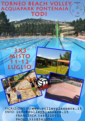 Sabato 11 e domenica 12 luglio ritorna il consueto appuntamento con la pallavolo sulla sabbia nella struttura dell’Acquapark di Todi in località Ponte Naia, al via un torneo organizzato da Francesca Micori con la collaborazione dei ragazzi di Volley Planners Perugia. Il regolamento prevede la partecipazione di squadre miste (composte da due uomini ed una donna, più un’eventuale riserva). La formula è dunque quella del tre contro tre con partite che si svolgeranno sulla distanza di set su tre al 15 (con eventuale killer-point al 18). È prevista la partecipazione di oltre venti squadre, diversi premi speciali e le divertenti sorprese per gli iscritti. Sul sito www.volleyplanners.it sono reperibili tutte le informazioni necessarie per la registrazione della squadra ed il regolamento dettagliato.