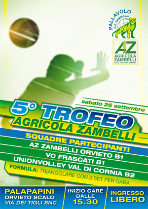 Trofeo Agricola Zambelli (locandina)Settembre è il periodo della preparazione atletica per le squadre di pallavolo che si preparano al campionato, tra gli appuntamenti classici del periodo c’è senza dubbio quello del Trofeo Agricola Zambelli. La quinta edizione della manifestazione vede partecipare tre squadre e si disputerà in una giornata unica, sabato 26 settembre, richiamando al palasport Alessio Papini la folla di sportivi e di appassionati della disciplina. C’è il desiderio di valutare le novità presenti nella Zambelli Orvieto che ospita tra le proprie mura una manifestazione di grande interesse che è sempre più stimata anche al di fuori dei confini regionali. Archiviate le prime due uscite stagionali che sono servite ad oliare i meccanismi, ora le atlete gialloverdi esordiscono ufficialmente, nella città del Duomo e della Rupe torna in scena uno spettacolo di altissimo livello. Antagoniste del collettivo delle tigri che è iscritto per la seconda volta alla serie B1 femminile saranno due rappresentanti delle regioni limitrofe all’Umbria, una del Lazio ed una della Toscana, territori dove opera l’azienda Zambelli. Oltre alle padrone di casa, scenderanno in campo per contendersi il gradino più alto del podio la Volley Club Frascati (B1) e la Union Volley Val di Cornia (B2). Le partite si disputeranno con la formula dei tre set comunque ed avranno inizio alle ore 15,30 con l’incontro Orvieto – Frascati, a seguire Val di Cornia affronterà prima la perdente e poi la vincente del match inaugurale. Alla vigilia della manifestazione il presidente Flavio Zambelli porge il suo benvenuto: «Questa manifestazione riveste un momento importante per l’azienda di famiglia che rappresento e che ha puntato da tempo nell’immagine pulita della pallavolo per valorizzare il suo marchio. Voglio ringrazio i club che hanno accettato il nostro invito a partecipare e ricordo agli orvietani di non mancare per gustarsi uno spettacolo che avrà come sempre ingresso gratuito».