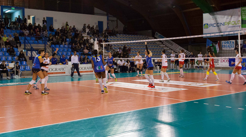 La Top Quality San Giustino vince per tre a zero all’esordio casalingo di serie B1 femminile sulla determinata matricola Pomarance.Name Cecina. Le altotiberine si presentano nel migliore dei modi davanti al pubblico amico, ma a dispetto di quanto dica il finale non ha assolutamente passeggiato. Anzi, soltanto il gran carattere ha permesso di recuperare le partenze sofferte in ogni set e di vincere il primo rimontando dal 16-23, così come in parte è avvenuto anche nel secondo, ma la neopromossa squadra livornese, trascinata dal capitano Giulia Genovesi e capace di realizzare 15 muri vincenti, ha avuto il merito di non mollare mai. Per ciò che riguarda le biancoazzurre, una Sofia Tosi ispirata ha eguagliato nello score Mirka Francia con 17 punti. Le toscane schierate con la diagonale Cavallini-Renieri, coppia centrale Mutti-Silvestri e a lato la Genovesi e la Paparelli, con libero la Sbrana. Della Balda risponde con il 6+1 annunciato: Izzo in regia, Francia opposto, La Rocca e Spicocchi al centro, Tosi e Falotico alla banda e Giorgi libero. Prologo con il freno a mano tirato per la le padrone di casa, al contrario del Cecina, che si dimostra subito tonico e va sul 6-2, rintuzzando il tentativo di rimonta con attacchi e muri che portano le ospiti sul massimo vantaggio (11-6). Le padrone di casa rispondono con un attacco ciascuno della Tosi e della Francia, che subisce anche due muri, ma con un maggiore ordine a livello di gioco le toscane allungano fino al 17-11. Tuttavia, un leggero momento di sbandamento favorisce un parziale recupero delle locali, che piazzano anche un ace con la Francia; un pallonetto spinto fuori campo di Jessica La Rocca e un diagonale di Renieri riportano avanti le ospiti, che con un attacco vincente della Paparelli (dopo un tocco in difesa del libero Sbrana che ha lasciato qualche dubbio) va sul 21-15 e una schiacciata fuori bersaglio della Tosi manda le tirreniche sul nuovo massimo vantaggio (22-15 e 23-16). Sembra fatta per la formazione di Berti, non fosse per il San Giustino che si sblocca e che, grazie anche a un paio di errori avversari, dapprima si riavvicina fino al 21-23, poi con una schiacciata della Falotico e un altro errore del Cecina agguanta la parità (24-24). Non si ferma più la squadra di Della Balda, che sul 25-25 è autrice di un miracoloso recupero in difesa trasformato in punto sulla successiva topica in palleggio della Cavallini. Chiude una precisa schiacciata della Falotico. In avvio di seconda frazione, Mirka Francia comincia ad avere la mano ‘calda’ e anche il muro è efficace, nonostante le toscane risponda colpo su colpo fino a passare sul 7-5, con replica affidata a due potenti colpi di Sofia Tosi. Le sangiustinesi tengono il naso avanti fino al 12-11, poi subiscono il ritorno avversario, con Renieri che al rientro è autrice del 17-14. Il finale esalta di nuovo le biancoazzurre, attente anche in difesa, una fast veloce della La Rocca e due conclusioni di precisione della Tosi portano San Giustino sul 18-18; un muro di Spicocchi e una schiacciata sullo spigolo di Tosi fanno 20-18. La battuta di Izzo ed un muro di Spicocchi consolidano ed un mani-fuori di Francia portano sul 24-20, il diagonale da posto-due di Tosi manda sul due a zero. Cecina ha il merito di non accusare il colpo e di prendere uno 0-4 d’acchito nel terzo set, serie interrotta da una battuta lunga della Silvestri. Un muro di Mutti su Spicocchi fa ripartire le toscane fino al 2-6, ma a cambiare il vento sono una risposta, sempre a muro, di Francia e un punto d’oro di Falotico che, sommati con un ace di Tosi, con un errore di Renieri e con altri attacchi a segno della Francia e di Falotico, portano San Giustino sul 9-6. Nel momento più difficile, le cecinesi si riorganizzano e trovano il pareggio sul 9-9; la Francia c’è e uno slash di La Rocca più un ace, ancora di Francia, portano di nuovo a +3 le altotiberine. Nuovo passaggio ideale di consegne in attacco fra Francia e Tosi, che trascina sul 16-13 la squadra al secondo time-out tecnico. Il punteggio scorre a fisarmonica con le locali sempre avanti, l’ottimo il muro di Izzo e l’attacco fuori di Genovesi producono il 19-16. Non è assolutamente finita, Genovesi si riscatta con un muro su Francia, prima che a concretizzare la rimonta sul 22-22 siano le schiacciate di Orzenini. La pipe di Francia è foriera del primo match-ball, annullato da Genovesi; una diagonale di Tosi e un ace a nastro di La Rocca fanno esultare il palasport, imbattuto ora da undici gare consecutive. Il tecnico Alessandro Della Balda riconosce i meriti alla squadra per ciò che ha saputo fare: «Debbo dare atto alle ragazze di aver tirato fuori un gran carattere nei momenti più difficili e avrei firmato alla vigilia nel sapere che saremmo riusciti a rimontare sul 16-23 per le nostre avversarie. Siamo ancora vittime dei filotti avversari e incappiamo in ingenuità che dobbiamo assolutamente eliminare, ma con tre punti in classifica, che anche moralmente valgono molto, possiamo lavorare in maniera più tranquilla».
