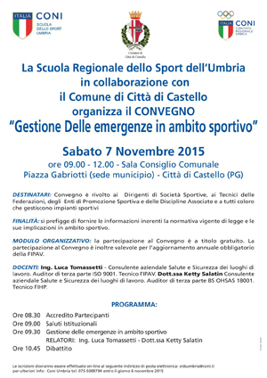 Gestione delle emergenze in ambito sportivo (locandina) Città di CastelloLa Scuola Regionale dello Sport dell’Umbria in collaborazione con il Comune di Città di Castello organizza il convegno ‘Gestione delle emergenze in ambito sportivo’ che si terrà sabato 7 novembre alla Sala del Consiglio comunale dalle ore 9 alle ore 12. Il convegno è rivolto ai dirigenti di società sportive, ai tecnici delle federazioni, degli enti di promozione sportiva e delle discipline associate ai tecnici delle amministrazioni proprietari degli impianti sportivi ed a tutti coloro che gestiscono impianti sportivi e si prefigge di fornire le informazioni inerenti la normativa vigente di legge e le sue implicazioni in ambito sportivo. La partecipazione al convegno è a titolo gratuito, i docenti saranno l’ingegnere Luca Tomassetti – consulente aziendale salute e sicurezza dei luoghi di lavoro (auditor di terza parte ISO 9001) e tecnico Fipav; la dott.ssa Ketty Salatin – consulente aziendale salute e sicurezza dei luoghi di lavoro (auditor di terza parte BS OHSAS 18001) e tecnico Fihp. Il programma prevede l’accredito di partecipanti a partire dalle ore 8,30 e dopo i saluti istituzionali (ore 9) l’intervento dei relatori, alle ore 10,45 l’appuntamento si chiuderà con un dibattito che anticiperà il termine dei lavori.